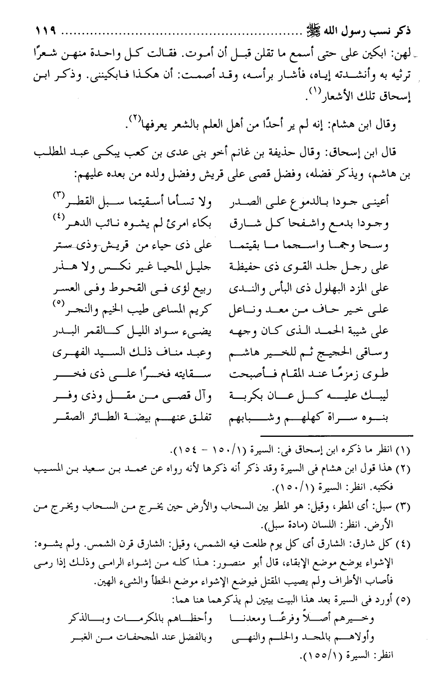 قال ابن إسحاق: وقال حذيفة بن غانم أخو بنى عدى بن كعب يبكى عبد المطلب بن هاشم، ويذكر فضله، وفضل قصى على قريش وفضل ولده من بعده عليهم: