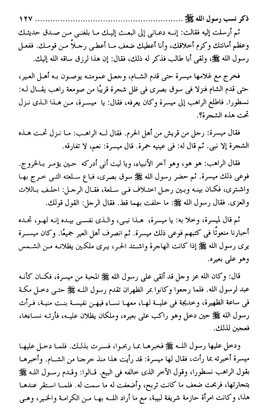 فقال ميسرة: رجل من قريش من أهل الحرم. فقال له الراهب: ما نزل تحت هذه الشجرة إلا نبى. ثم قال له: فى عينيه حمرة. قال ميسرة: نعم، لا تفارقه.
