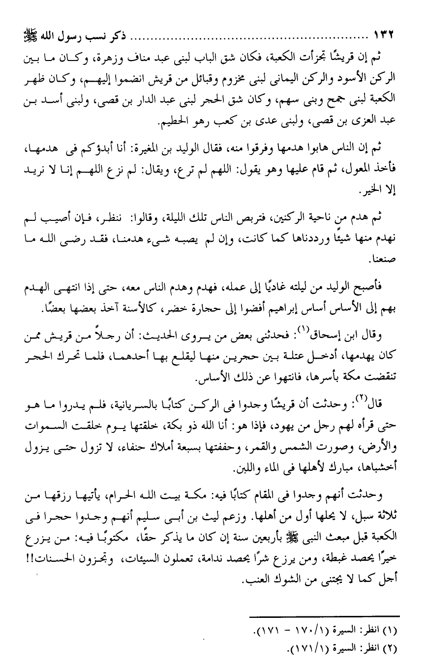 فأصبح الوليد من ليلته غاديا إلى عمله، فهدم وهدم الناس معه، حتى إذا انتهى الهدم بهم إلى الأساس أساس إبراهيم أفضوا إلى حجارة خضر، كالأسنة آخذ بعضها بعضا.