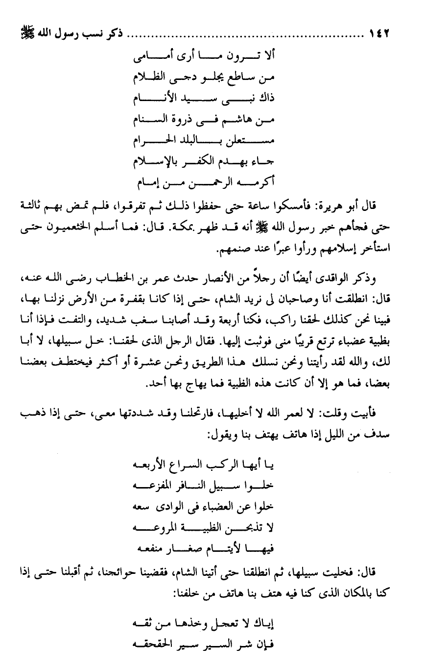 فأبيت وقلت: لا لعمر الله لا أخليها، فارتحلنا وقد شددتها معى، حتى إذا ذهب سدف من الليل إذا هاتف يهتف بنا ويقول: