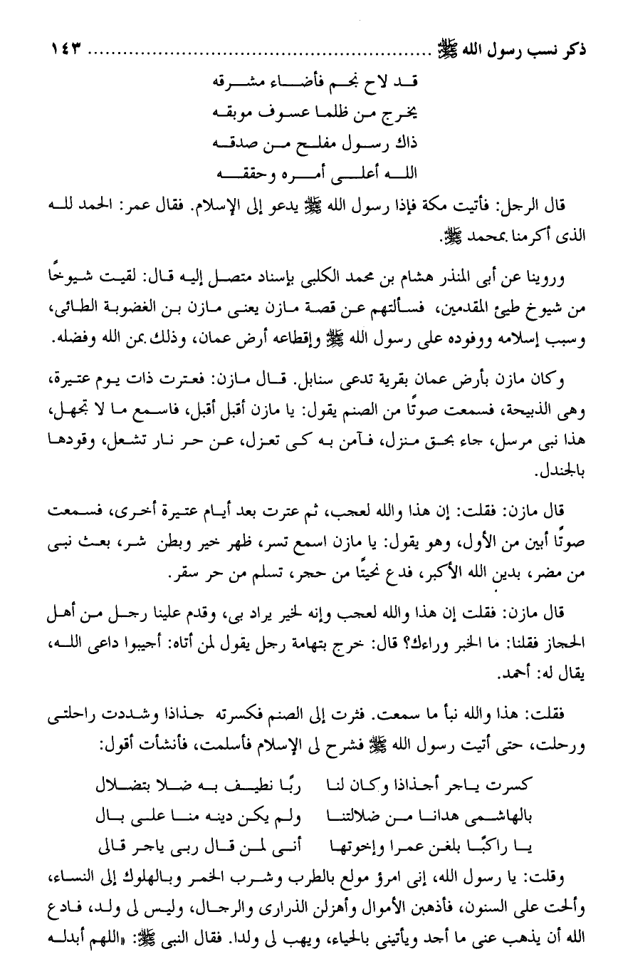 قال مازن: فقلت إن هذا والله لعجب وإنه لخير يراد بى، وقدم علينا رجل من أهل الحجاز فقلنا: ما الخبر وراءك؟ قال: خرج بتهامة رجل يقول لمن أتاه: أجيبوا داعى الله، يقال له: أحمد.