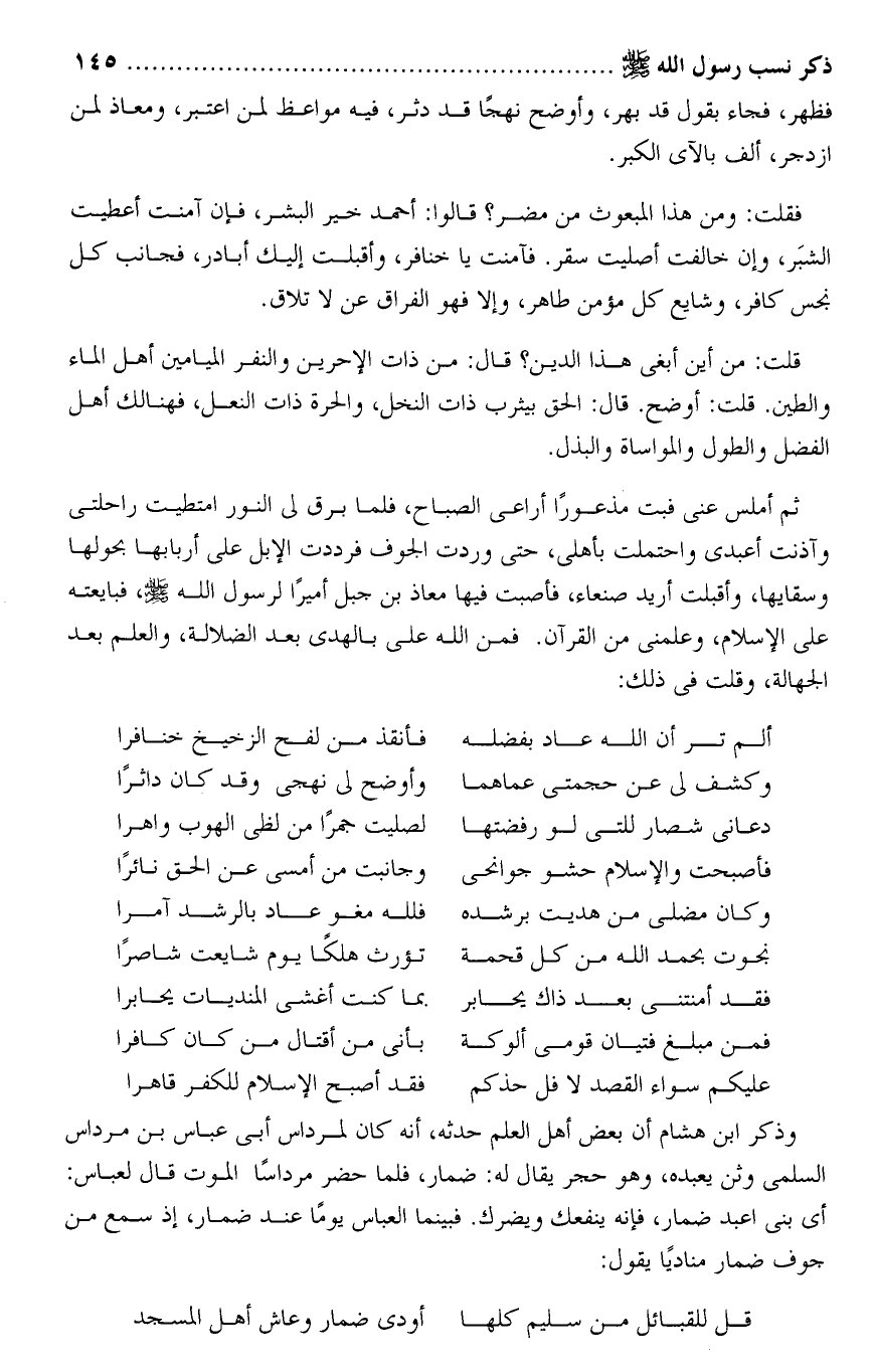 فقلت: ومن هذا المبعوث من مضر؟ قالوا: أحمد خير البشر، فإن آمنت أعطيت الشبر، وإن خالفت أصليت سقر. فآمنت يا خنافر، وأقبلت إليك أبادر، فجانب كل نجس كافر، وشايع كل مؤمن طاهر، وإلا فهو الفراق عن لا تلاق.