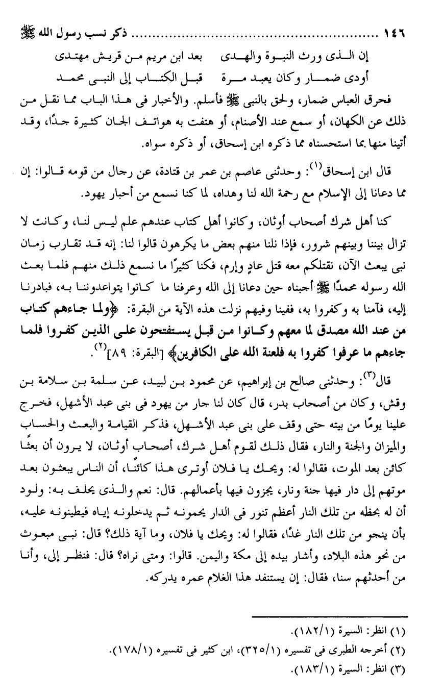 قال ابن إسحاق «1» : وحدثنى عاصم بن عمر بن قتادة، عن رجال من قومه قالوا: إن مما دعانا إلى الإسلام مع رحمة الله لنا وهداه، لما كنا نسمع من أحبار يهود.