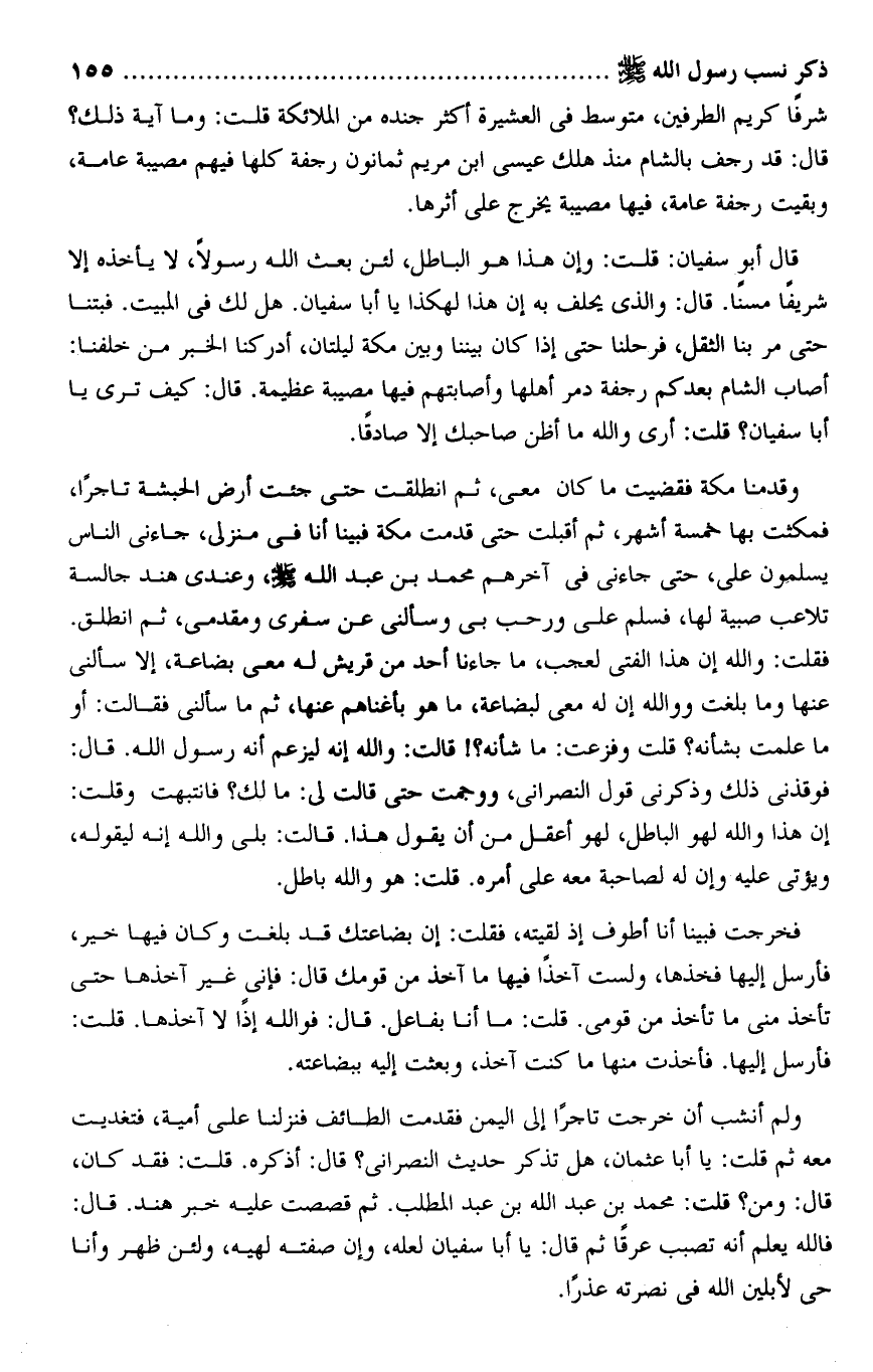 قال أبو سفيان: قلت: وإن هذا هو الباطل، لئن بعث الله رسولا، لا يأخذه إلا شريفا مسنا. قال: والذى يحلف به إن هذا لهكذا يا أبا سفيان. هل لك فى المبيت. فبتنا حتى مر بنا الثقل، فرحلنا حتى إذا كان بيننا وبين مكة ليلتان، أدركنا الخبر من خلفنا: