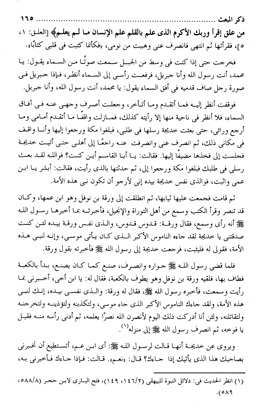 مِنْ عَلَقٍ اقْرَأْ وَرَبُّكَ الْأَكْرَمُ الَّذِي عَلَّمَ بِالْقَلَمِ عَلَّمَ الْإِنْسانَ ما لَمْ يَعْلَمْ [العلق: 1، 5] ، فقرأتها ثم انتهى فانصرف عنى وهببت من نومى، «فكأنما كتبت فى قلبى كتابا» .