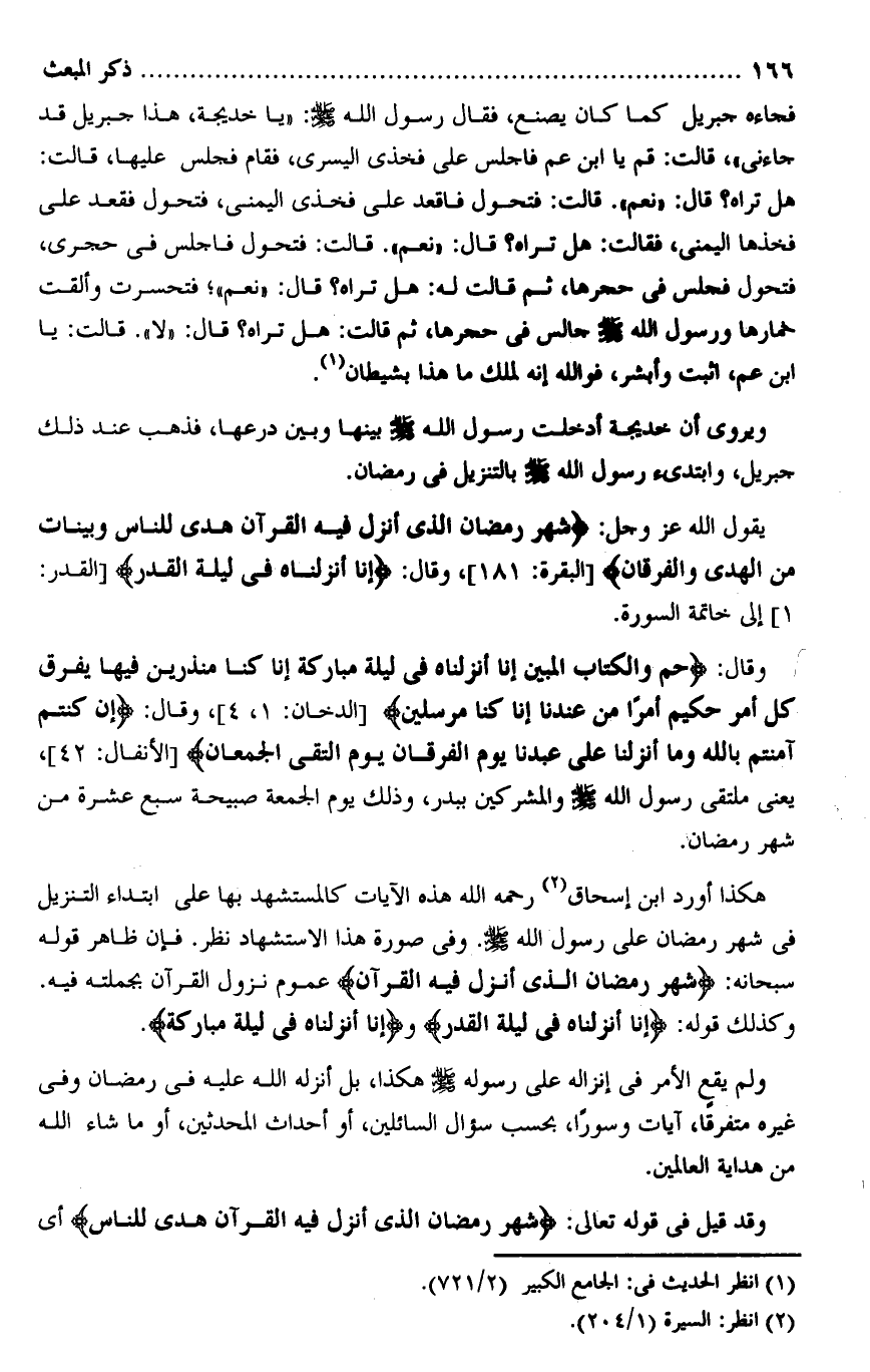 ويروى أن خديجة أدخلت رسول الله صلى الله عليه وسلم بينها وبين درعها، فذهب عند ذلك جبريل، وابتدىء رسول الله صلى الله عليه وسلم بالتنزيل فى رمضان.