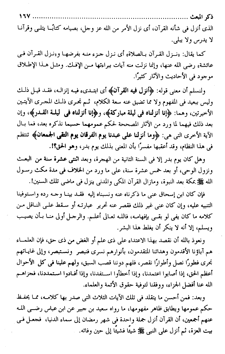 ولنسلم أن معنى قوله: أُنْزِلَ فِيهِ الْقُرْآنُ أى ابتدىء فيه إنزاله، فقد قيل ذلك وليس ببعيد فى المفهوم ولا مما تضيق عنه سعة الكلام، ثم نجرى ذلك المجرى الآيتين الأخيرتين، وهما: إِنَّا أَنْزَلْناهُ فِي لَيْلَةٍ مُبارَكَةٍ، وإِنَّا أَنْزَلْناهُ فِي لَيْلَةِ الْقَدْرِ، وإن بعد ذلك فيهما لما ورد من الآثار المصححة لحكم عمومهما حسبما نذكره بعد، فما بال الآية الأخرى التى هى: وَما أَنْزَلْنا عَلى عَبْدِنا يَوْمَ الْفُرْقانِ يَوْمَ الْتَقَى الْجَمْعانِ تنتظم فى هذا النظام، وقد أعقبها مفسرا بأن المعنى بذلك يوم بدر، وهو الحق؟!.