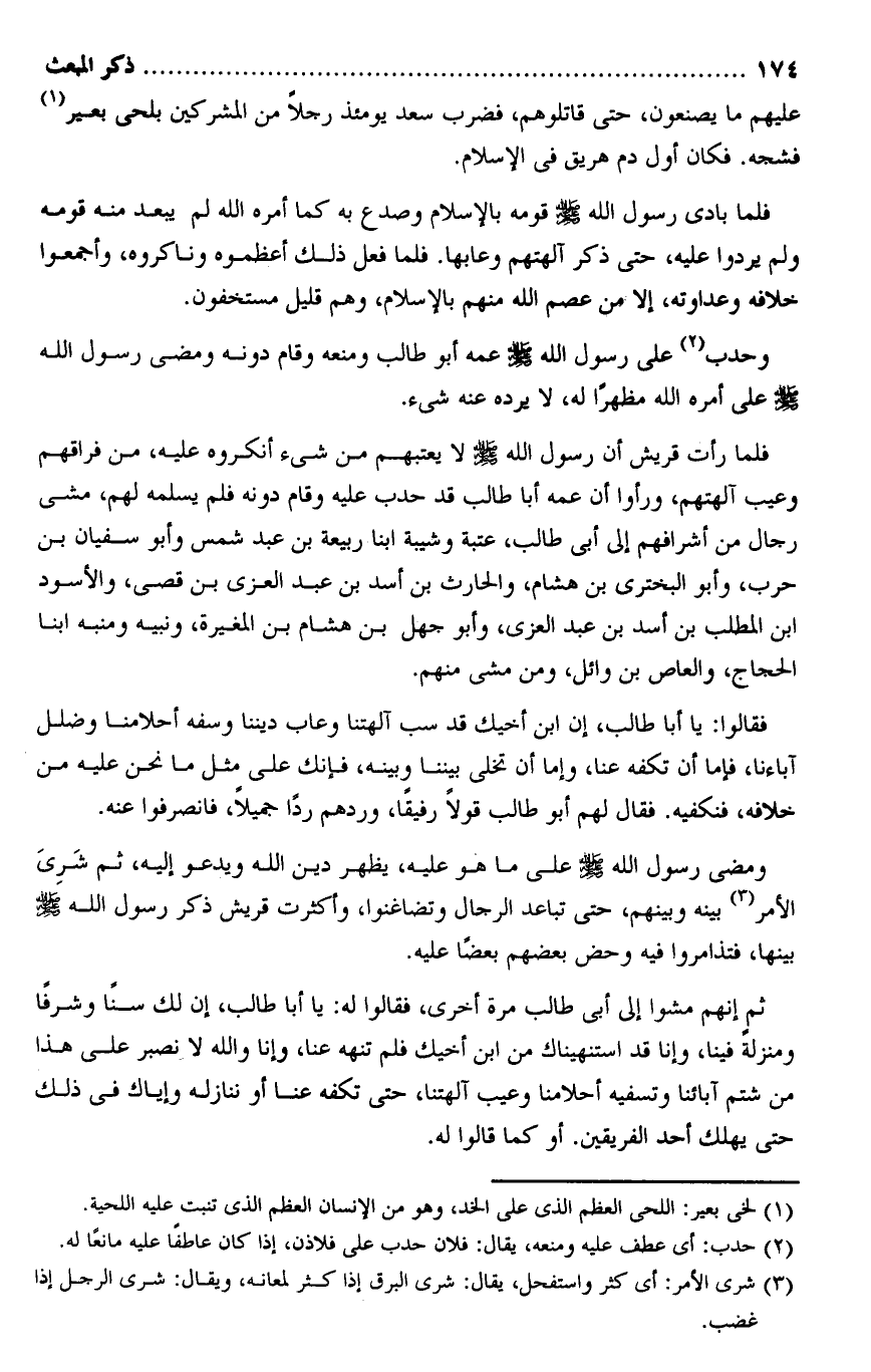 ثم إنهم مشوا إلى أبى طالب مرة أخرى، فقالوا له: يا أبا طالب، إن لك سنا وشرفا ومنزلة فينا، وإنا قد استنهيناك من ابن أخيك فلم تنهه عنا، وإنا والله لا نصبر على هذا من شتم آبائنا وتسفيه أحلامنا وعيب آلهتنا، حتى تكفه عنا أو ننازله وإياك فى ذلك حتى يهلك أحد الفريقين. أو كما قالوا له.