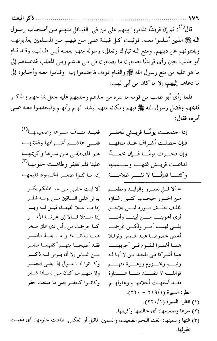 فلما رأى أبو طالب من قومه ما سره من جدهم وحدبهم عليه جعل يمدحهم ويذكر قديمهم وفضل رسول الله صلى الله عليه وسلم فيهم ومكانه منهم ليشد لهم رأيهم وليحدبوا معه على أمره، فقال: