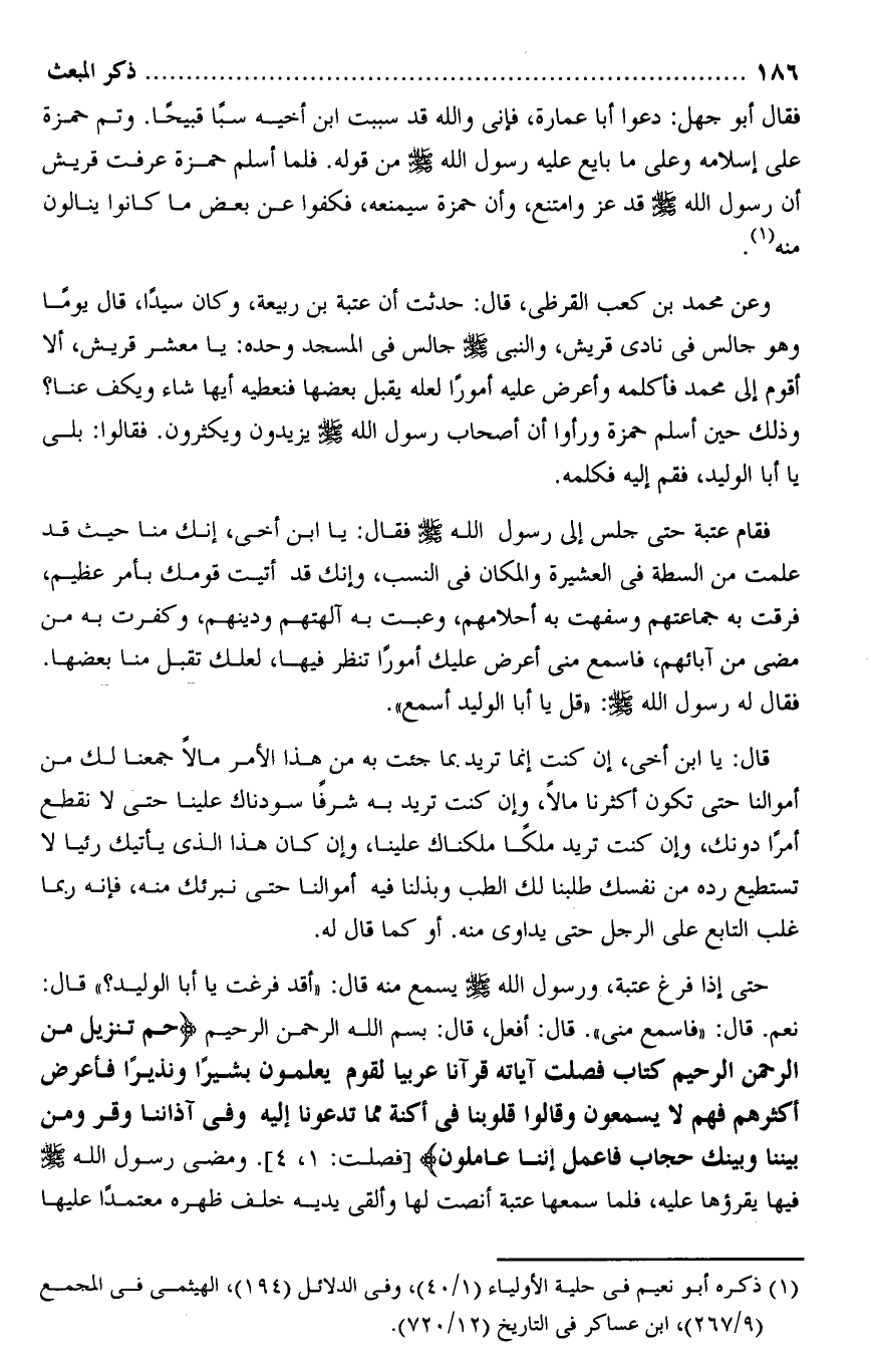 نعم. قال: «فاسمع منى» . قال: أفعل، قال: بسم الله الرحمن الرحيم حم تَنْزِيلٌ مِنَ الرَّحْمنِ الرَّحِيمِ كِتابٌ فُصِّلَتْ آياتُهُ قُرْآناً عَرَبِيًّا لِقَوْمٍ يَعْلَمُونَ بَشِيراً وَنَذِيراً فَأَعْرَضَ أَكْثَرُهُمْ فَهُمْ لا يَسْمَعُونَ وَقالُوا قُلُوبُنا فِي أَكِنَّةٍ مِمَّا تَدْعُونا إِلَيْهِ وَفِي آذانِنا وَقْرٌ وَمِنْ بَيْنِنا وَبَيْنِكَ حِجابٌ فَاعْمَلْ إِنَّنا عامِلُونَ [فصلت: 1، 4] . ومضى رسول الله صلى الله عليه وسلم فيها يقرؤها عليه، فلما سمعها عتبة أنصت لها وألقى يديه خلف ظهره معتمدا عليها