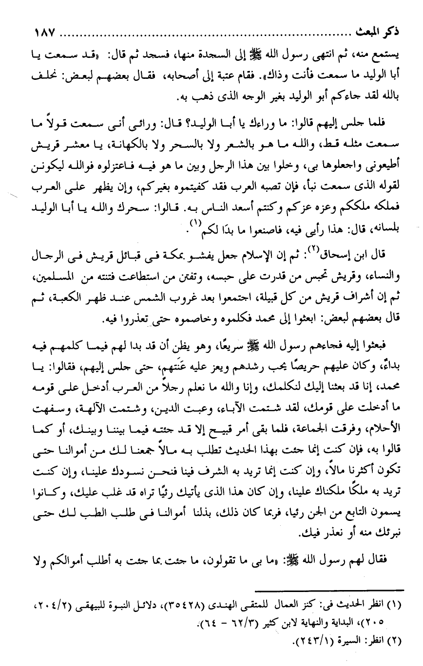 فبعثوا إليه فجاءهم رسول الله صلى الله عليه وسلم سريعا، وهو يظن أن قد بدا لهم فيما كلمهم فيه بداء، وكان عليهم حريصا يحب رشدهم ويعز عليه عنتهم، حتى جلس إليهم، فقالوا: يا محمد، إنا قد بعثنا إليك لنكلمك، وإنا والله ما نعلم رجلا من العرب أدخل على قومه ما أدخلت على قومك، لقد شتمت الآباء، وعبت الدين، وشتمت الآلهة، وسفهت الأحلام، وفرقت الجماعة، فلما بقى أمر قبيح إلا قد جئته فيما بيننا وبينك، أو كما قالوا به، فإن كنت إنما جئت بهذا الحديث تطلب به مالا جمعنا لك من أموالنا حتى تكون أكثرنا مالا، وإن كنت إنما تريد به الشرف فينا فنحن نسودك علينا، وإن كنت تريد به ملكا ملكناك علينا، وإن كان هذا الذى يأتيك رئيا تراه قد غلب عليك، وكانوا يسمون التابع من الجن رئيا، فربما كان ذلك، بذلنا أموالنا فى طلب الطب لك حتى نبرئك منه أو نعذر فيك.