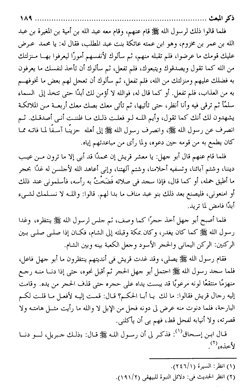 فلما قام عنهم قال أبو جهل: يا معشر قريش إن محمدا قد أبى إلا ما ترون من عيب ديننا، وشتم آبائنا، وتسفيه أحلامنا، وشتم آلهتنا، وإنى أعاهد الله لأجلسن له غدا بحجر ما أطيق حمله، أو كما قال، فإذا سجد فى صلاته فضخت به رأسه، فأسلمونى عند ذلك أو امنعونى، فليصنع بعد ذلك بنو عبد مناف ما بدا لهم. قالوا: والله لا نسلمك لشىء أبدا فامض لما تريد.