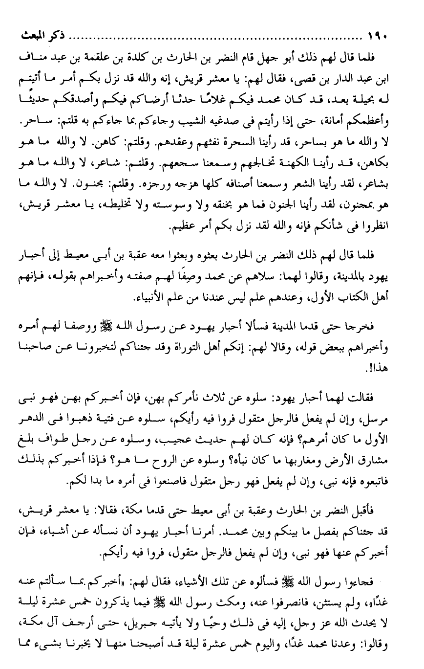 فأقبل النضر بن الحارث وعقبة بن أبى معيط حتى قدما مكة، فقالا: يا معشر قريش، قد جئناكم بفصل ما بينكم وبين محمد. أمرنا أحبار يهود أن نسأله عن أشياء، فإن أخبركم عنها فهو نبى، وإن لم يفعل فالرجل متقول، فروا فيه رأيكم.