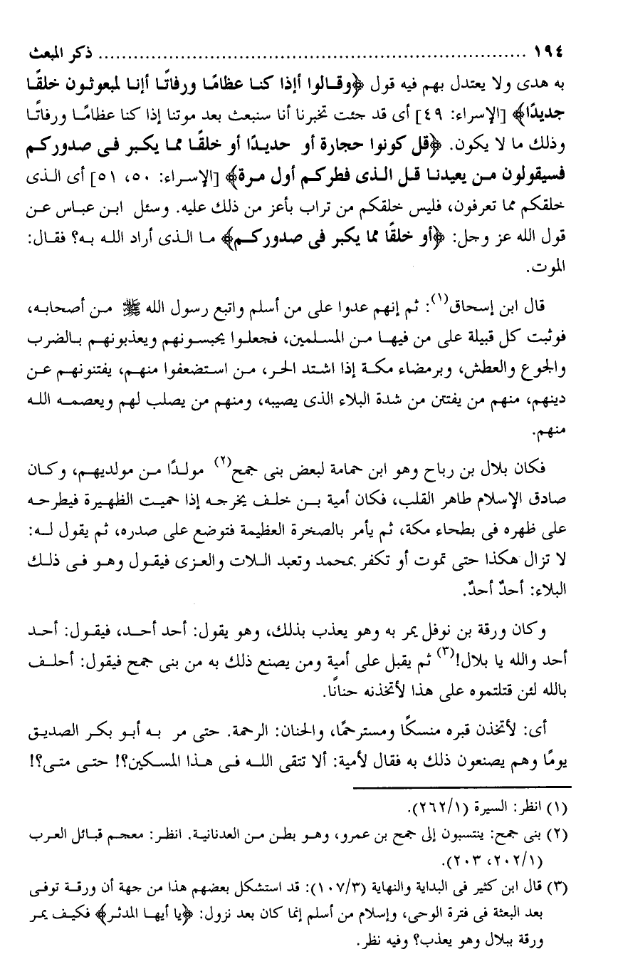 (3) قال ابن كثير فى البداية والنهاية (3/ 107) : قد استشكل بعضهم هذا من جهة أن ورقة توفى بعد البعثة فى فترة الوحى، وإسلام من أسلم إنما كان بعد نزول: يا أَيُّهَا الْمُدَّثِّرُ فكيف يمر ورقة ببلال وهو يعذب؟ وفيه نظر.
