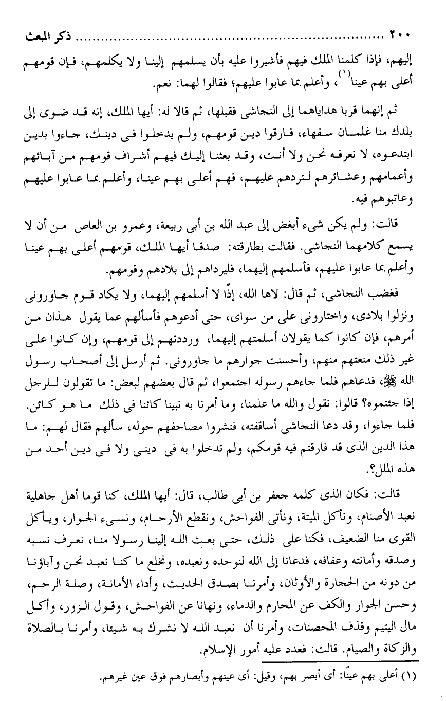 ثم إنهما قربا هداياهما إلى النجاشى فقبلها، ثم قالا له: أيها الملك، إنه قد ضوى إلى بلدك منا غلمان سفهاء، فارقوا دين قومهم، ولم يدخلوا فى دينك، جاؤا بدين ابتدعوه، لا نعرفه نحن ولا أنت، وقد بعثنا إليك فيهم أشراف قومهم من آبائهم وأعمامهم وعشائرهم لتردهم عليهم، فهم أعلى بهم عينا، وأعلم بما عابوا عليهم وعاتبوهم فيه.