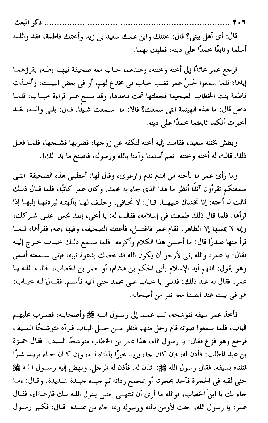 فرجع عمر عائدا إلى أخته وختنه، وعندهما خباب معه صحيفة فيها «طه» يقرؤهما إياها، فلما سمعوا حسّ عمر تغيب خباب فى مخدع لهم، أو فى بعض البيت، وأخذت فاطمة بنت الخطاب الصحيفة فجعلتها تحت فخذها، وقد سمع عمر قراءة خباب، فلما دخل قال: ما هذه الهينمة التى سمعت؟ قالا: ما سمعت شيئا. قال: بلى والله، لقد أخبرت أنكما تابعتما محمدا على دينه.