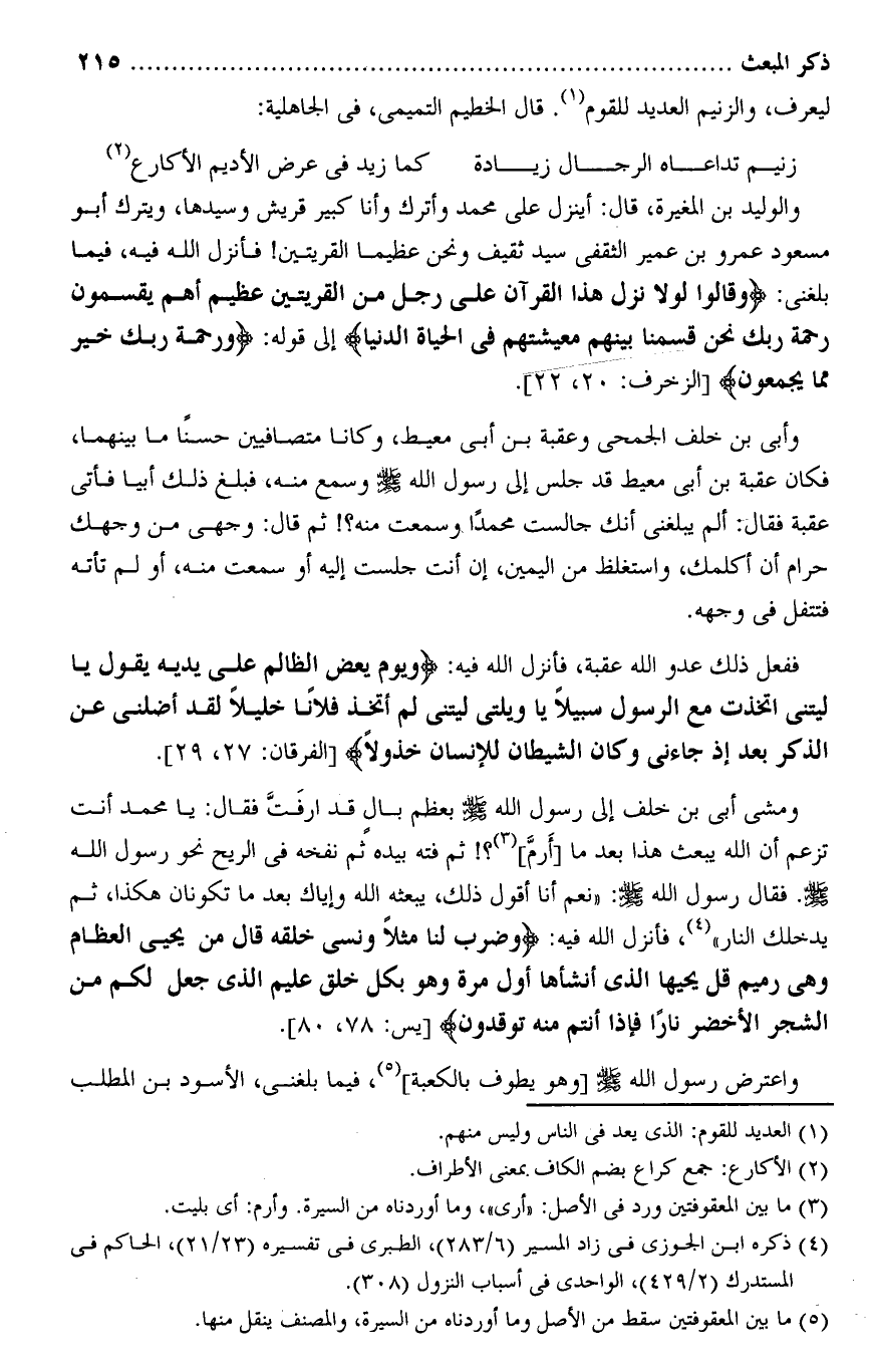 ومشى أبى بن خلف إلى رسول الله صلى الله عليه وسلم بعظم بال قد ارفتّ فقال: يا محمد أنت تزعم أن الله يبعث هذا بعد ما [أرمّ] «3» ؟! ثم فته بيده ثم نفخه فى الريح نحو رسول الله صلى الله عليه وسلم. فقال رسول الله صلى الله عليه وسلم: «نعم أنا أقول ذلك، يبعثه الله وإياك بعد ما تكونان هكذا، ثم يدخلك النار» «4» ، فأنزل الله فيه: وَضَرَبَ لَنا مَثَلًا وَنَسِيَ خَلْقَهُ قالَ مَنْ يُحْيِ الْعِظامَ وَهِيَ رَمِيمٌ قُلْ يُحْيِيهَا الَّذِي أَنْشَأَها أَوَّلَ مَرَّةٍ وَهُوَ بِكُلِّ خَلْقٍ عَلِيمٌ الَّذِي جَعَلَ لَكُمْ مِنَ الشَّجَرِ الْأَخْضَرِ ناراً فَإِذا أَنْتُمْ مِنْهُ تُوقِدُونَ [يس: 78، 80] .