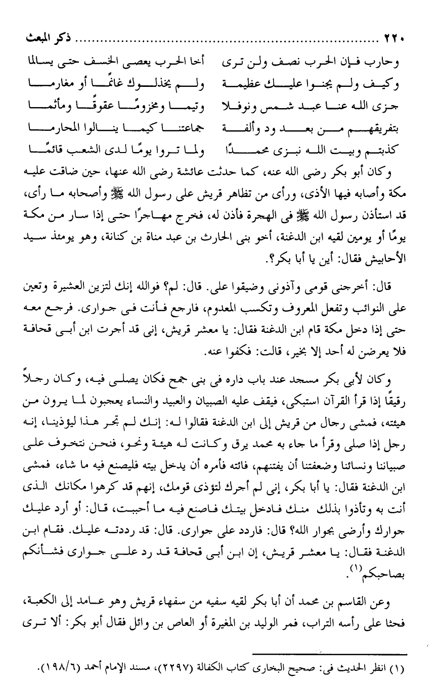 قال: أخرجنى قومى وآذونى وضيقوا على. قال: لم؟ فو الله إنك لتزين العشيرة وتعين على النوائب وتفعل المعروف وتكسب المعدوم، فارجع فأنت فى جوارى. فرجع معه حتى إذا دخل مكة قام ابن الدغنة فقال: يا معشر قريش، إنى قد أجرت ابن أبى قحافة فلا يعرضن له أحد إلا بخير، قالت: فكفوا عنه.