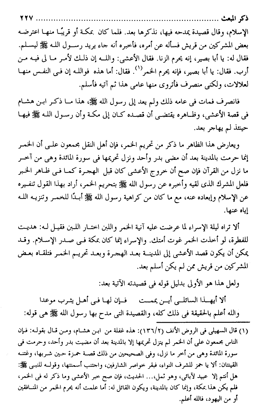 (1) قال السهيلى فى الروض الأنف (2/ 136) : هذه غفلة من ابن هشام، ومن قال بقوله: فإن الناس مجمعون على أن الخمر لم ينزل تحريمها إلا بالمدينة بعد أن مضيت بدر وأحد، وحرمت فى سورة المائدة وهى من أخر ما نزل، وفى الصحيحين من ذلك قصة حمزة حين شربها، وغتنه القينتان: ألا يا حمز للشرف النواء، فبقر خواصر الشارفين، واجتنب أسمنتها، وقوله للنبى صلى الله عليه وسلم: هل أنتم إلا عبيد لآبائى، وهو ثمل، ... الحديث، فإن صح خبر الأعشى وما ذكر له فى الخمر، فلم يكن هذا بمكة، وإنما كان بالمدينة، ويكون القائل له: أما علمت أنه يحرم الخمر من المنافقين أو من اليهود، فالله أعلم.
