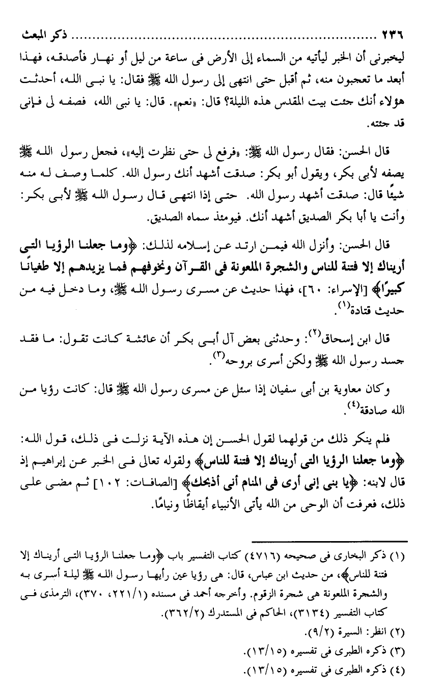 قال الحسن: وأنزل الله فيمن ارتد عن إسلامه لذلك: وَما جَعَلْنَا الرُّؤْيَا الَّتِي أَرَيْناكَ إِلَّا فِتْنَةً لِلنَّاسِ وَالشَّجَرَةَ الْمَلْعُونَةَ فِي الْقُرْآنِ وَنُخَوِّفُهُمْ فَما يَزِيدُهُمْ إِلَّا طُغْياناً كَبِيراً [الإسراء: 60] ، فهذا حديث عن مسرى رسول الله صلى الله عليه وسلم، وما دخل فيه من حديث قتادة «1» .