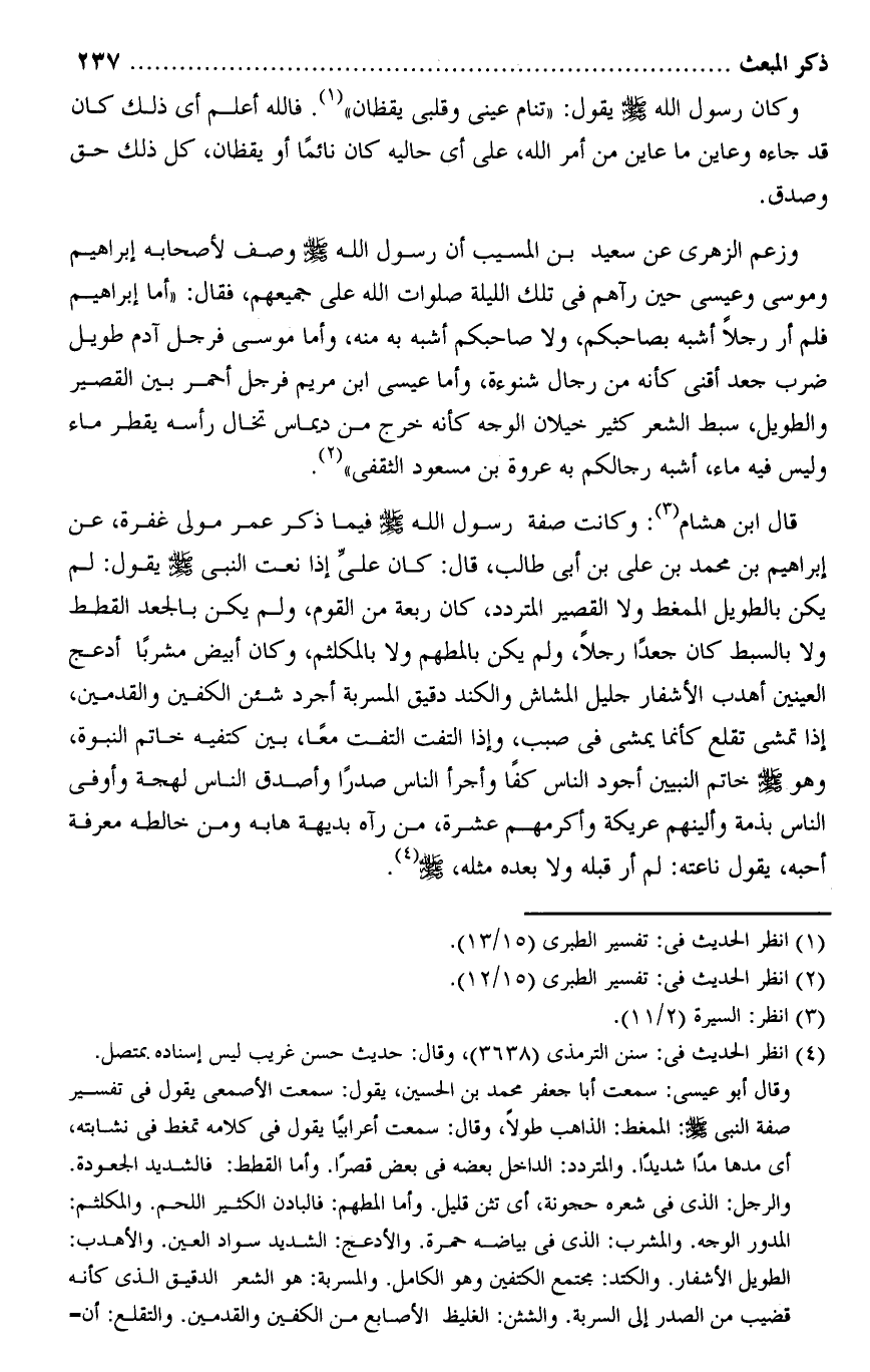 وزعم الزهرى عن سعيد بن المسيب أن رسول الله صلى الله عليه وسلم وصف لأصحابه إبراهيم وموسى وعيسى حين رآهم فى تلك الليلة صلوات الله على جميعهم، فقال: «أما إبراهيم فلم أر رجلا أشبه بصاحبكم، ولا صاحبكم أشبه به منه، وأما موسى فرجل آدم طويل ضرب جعد أقنى كأنه من رجال شنوءة، وأما عيسى ابن مريم فرجل أحمر بين القصير والطويل، سبط الشعر كثير خيلان الوجه كأنه خرج من ديماس تخال رأسه يقطر ماء وليس فيه ماء، أشبه رجالكم به عروة بن مسعود الثقفى» «2» .
