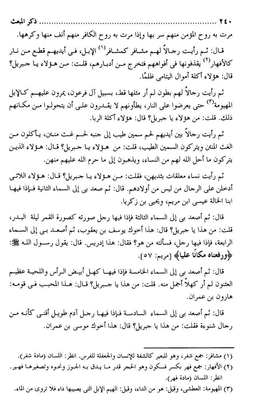 ثم رأيت رجالا لهم بطون لم أر مثلها قط، بسبيل آل فرعون، يمرون عليهم كالإبل المهيومة «3» حتى يعرضوا على النار، يطأونهم لا يقدرون على أن يتحولوا من مكانهم ذلك. قلت: من هؤلاء يا جبريل؟ قال: هؤلاء أكلة الربا.