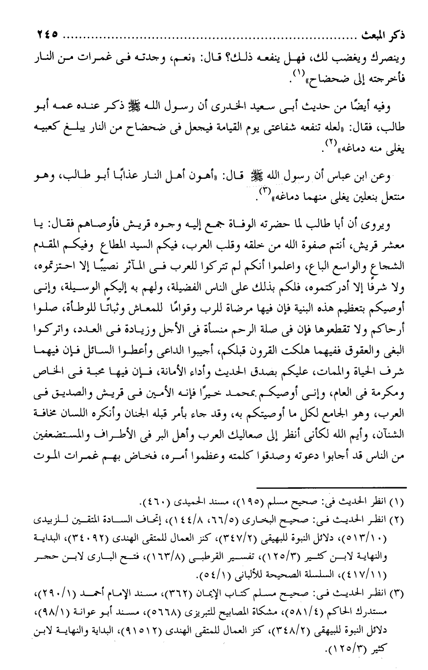 وفيه أيضا من حديث أبى سعيد الخدرى أن رسول الله صلى الله عليه وسلم ذكر عنده عمه أبو طالب، فقال: «لعله تنفعه شفاعتى يوم القيامة فيجعل فى ضحضاح من النار يبلغ كعبيه يغلى منه دماغه» «2» .