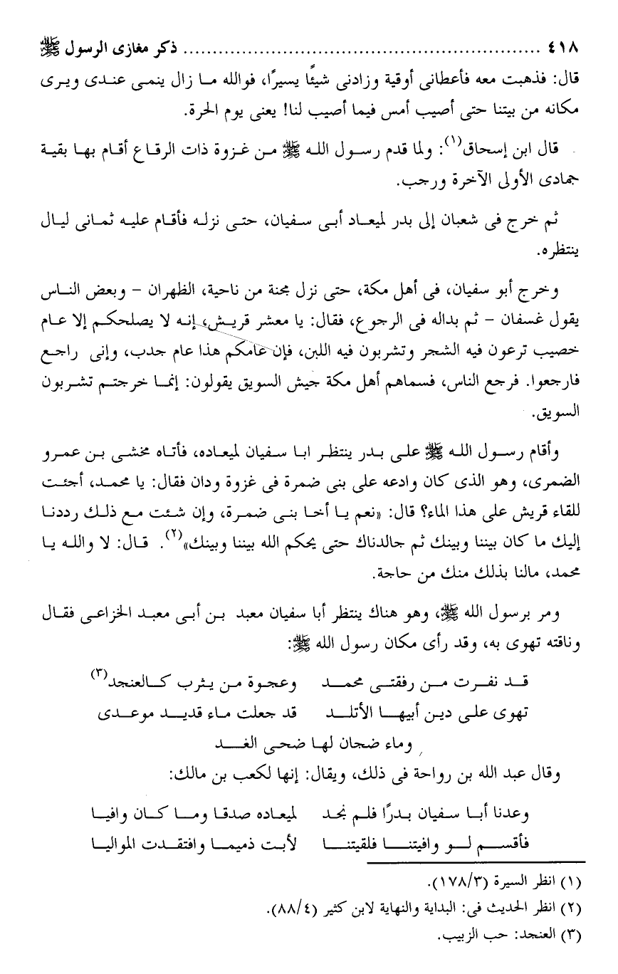 وخرج أبو سفيان، فى أهل مكة، حتى نزل مجنة من ناحية، الظهران- وبعض الناس يقول غسفان- ثم بداله فى الرجوع، فقال: يا معشر قريش، إنه لا يصلحكم إلا عام خصيب ترعون فيه الشجر وتشربون فيه اللبن، فإن عامكم هذا عام جدب، وإنى راجع فارجعوا. فرجع الناس، فسماهم أهل مكة جيش السويق يقولون: إنما خرجتم تشربون السويق.