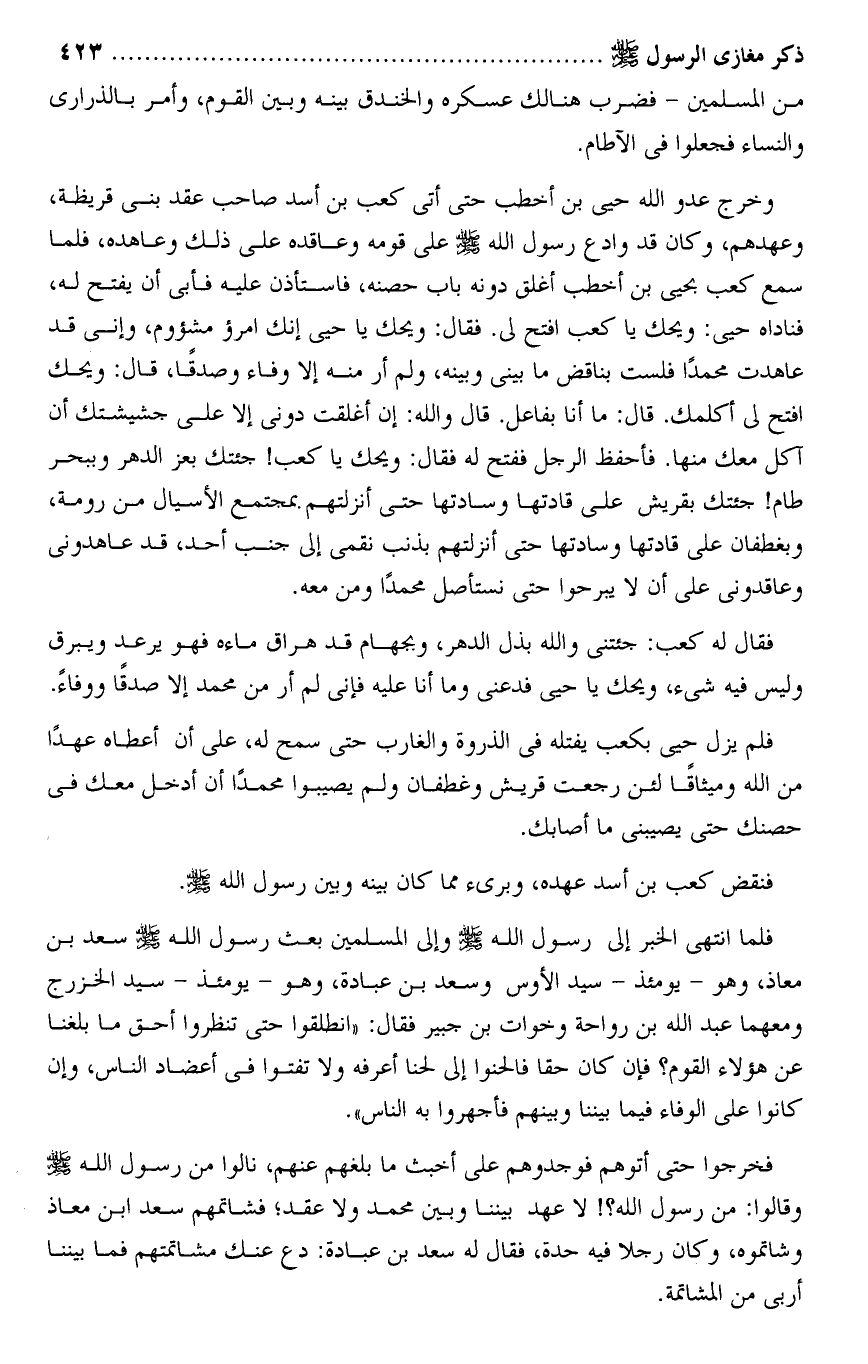 وخرج عدو الله حيى بن أخطب حتى أتى كعب بن أسد صاحب عقد بنى قريظة، وعهدهم، وكان قد وادع رسول الله صلى الله عليه وسلم على قومه وعاقده على ذلك وعاهده، فلما سمع كعب بحيى بن أخطب أغلق دونه باب حصنه، فاستأذن عليه فأبى أن يفتح له، فناداه حيى: ويحك يا كعب افتح لى. فقال: ويحك يا حيى إنك امرؤ مشؤوم، وإنى قد عاهدت محمدا فلست بناقض ما بينى وبينه، ولم أر منه إلا وفاء وصدقا، قال: ويحك افتح لى أكلمك. قال: ما أنا بفاعل. قال والله: إن أغلقت دونى إلا على جشيشتك أن آكل معك منها. فأحفظ الرجل ففتح له فقال: ويحك يا كعب! جئتك بعز الدهر وببحر طام! جئتك بقريش على قادتها وسادتها حتى أنزلتهم بمجتمع الأسيال من رومة، وبغطفان على قادتها وسادتها حتى أنزلتهم بذنب نقمى إلى جنب أحد، قد عاهدونى وعاقدونى على أن لا يبرحوا حتى نستأصل محمدا ومن معه.