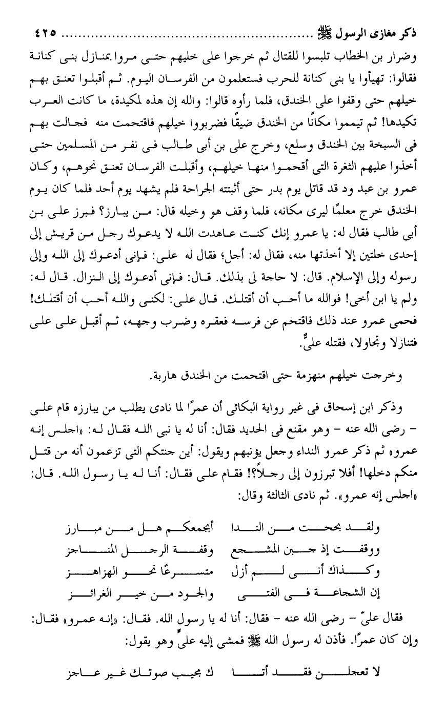 وضرار بن الخطاب تلبسوا للقتال ثم خرجوا على خليهم حتى مروا بمنازل بنى كنانة فقالوا: تهيأوا يا بنى كنانة للحرب فستعلمون من الفرسان اليوم. ثم أقبلوا تعنق بهم خيلهم حتى وقفوا على الخندق، فلما رأوه قالوا: والله إن هذه لمكيدة، ما كانت العرب تكيدها! ثم تيمموا مكانا من الخندق ضيقا فضربووا خيلهم فاقتحمت منه فجالت بهم فى السبخة بين الخندق وسلع، وخرج على بن أبى طالب فى نفر من المسلمين حتى أخذوا عليهم الثغرة التى أقحموا منها خيلهم، وأقبلت الفرسان تعنق نحوهم، وكان عمرو بن عبد ود قد قاتل يوم بدر حتى أثبتته الجراحة فلم يشهد يوم أحد فلما كان يوم الخندق خرج معلما ليرى مكانه، فلما وقف هو وخيله قال: من يبارز؟ فبرز على بن أبى طالب فقال له: يا عمرو إنك كنت عاهدت الله لا يدعوك رجل من قريش إلى إحدى خلتين إلا أخذتها منه، فقال له: أجل؛ فقال له على: فإنى أدعوك إلى الله وإلى رسوله وإلى الإسلام. قال: لا حاجة لى بذلك. قال: فإنى أدعوك إلى النزال. قال له: