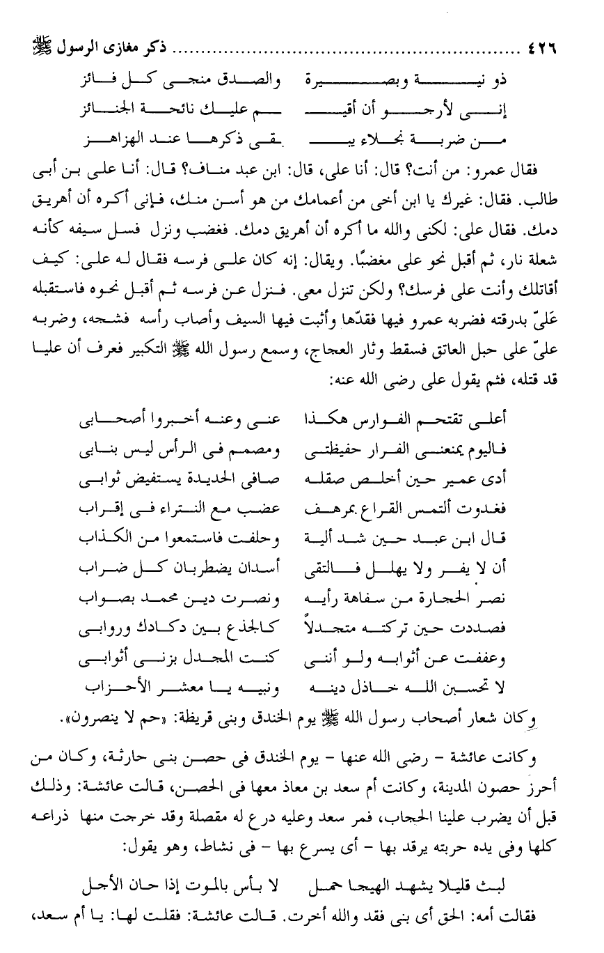 فقال عمرو: من أنت؟ قال: أنا على، قال: ابن عبد مناف؟ قال: أنا على بن أبى طالب. فقال: غيرك يا ابن أخى من أعمامك من هو أسن منك، فإنى أكره أن أهريق دمك. فقال على: لكنى والله ما أكره أن أهريق دمك. فغضب ونزل فسل سيفه كأنه شعلة نار، ثم أقبل نحو على مغضبا. ويقال: إنه كان على فرسه فقال له على: كيف أقاتلك وأنت على فرسك؟ ولكن تنزل معى. فنزل عن فرسه ثم أقبل نحوه فاستقبله علىّ بدرقته فضربه عمرو فيها فقدّها وأثبت فيها السيف وأصاب رأسه فشجه، وضربه علىّ على حبل العاتق فسقط وثار العجاج، وسمع رسول الله صلى الله عليه وسلم التكبير فعرف أن عليا قد قتله، فثم يقول على رضى الله عنه: