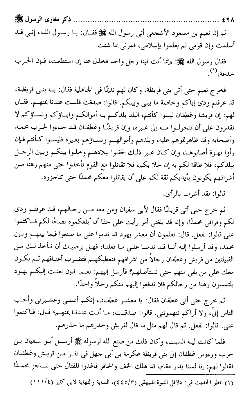 فخرج نعيم حتى أتى بنى قريظة، وكان لهم نديما فى الجاهلية فقال: يا بنى قريظة، قد عرفتم ودى إياكم وخاصة ما بينى وبينكم. قالوا: صدقت فلست عندنا بمتهم. فقال لهم: إن قريشا وغطفان ليسوا كأنتم، البلد بلدكم به أموالكم وابناؤكم ونساؤكم لا تقدرون على أن تتحولوا منه إلى غيره، وإن قريشا وغطفان قد جاؤا لحرب محمد وأصحابه وقد ظاهرتموهم عليه، وبلدهم وأموالهم ونساؤهم بغيره فليسوا كأنتم فإن رأوا نهزة أصابوها، وإن كان غير ذلك لحقوا ببلادهم وخلوا بينكم وبين الرجل ببلدكم، فلا طاقة لكم به إن خلا بكم، فلا تقاتلوا مع القوم تأخذوا حتى منهم رهنا من أشرافهم يكونون بأيديكم ثقة لكم على أن يقاتلوا معكم محمدا حتى تناجزوه.