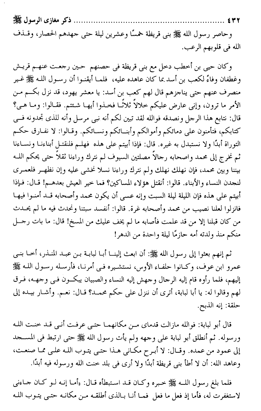 قال: نتابع هذا الرجل ونصدقه فو الله لقد تبين لكم أنه نبى مرسل وأنه للذى تجدونه فى كتابكم، فتأمنون على دمائكم وأموالكم وأبنائكم ونسائكم. وقالوا: لا نفارق حكم التوراة أبدا ولا نستبدل به غيره. قال: فإذا أبيتم على هذه فهلم فلنقتل أبناءنا ونساءنا ثم نخرج إلى محمد واصحابه رجالا مصلتين السيوف لم نترك وراءنا ثقلا حتى يحكم الله بيننا وبين محمد، فإن نهلك نهلك ولم نترك وراءنا نسلا نخشى عليه وإن نظهر فلعمرى لنجدن النساء والأبناء. قالوا: أنقتل هؤلاء المساكين؟ فما خير العيش بعدهم! قال: فإذا أبيتم على هذه فإن الليلة ليلة السبت وإنه عسى أن يكون محمد وأصحابه قد أمنوا فيها فانزلوا لعلنا نصيب من محمد وأصحابه غرة. قالوا: أنفسد سبتنا ونحدث فيه ما لم يحدث من كان قبلنا إلا من قد علمت فأصابه ما لم يخف عليك من المسخ! قال: ما بات رجل منكم منذ ولدته أمه حازما ليلة واحدة من الدهر!