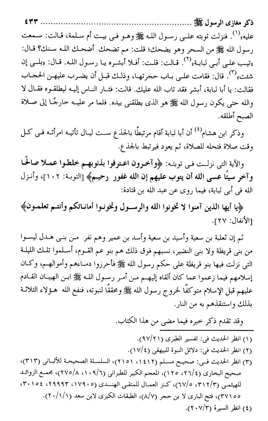 والآية التى نزلت فى توبته: وَآخَرُونَ اعْتَرَفُوا بِذُنُوبِهِمْ خَلَطُوا عَمَلًا صالِحاً وَآخَرَ سَيِّئاً عَسَى اللَّهُ أَنْ يَتُوبَ عَلَيْهِمْ إِنَّ اللَّهَ غَفُورٌ رَحِيمٌ [التوبة: 102] ، وأنزل الله فى أبى لبابة، فيما روى عن عبد الله بن قتادة: