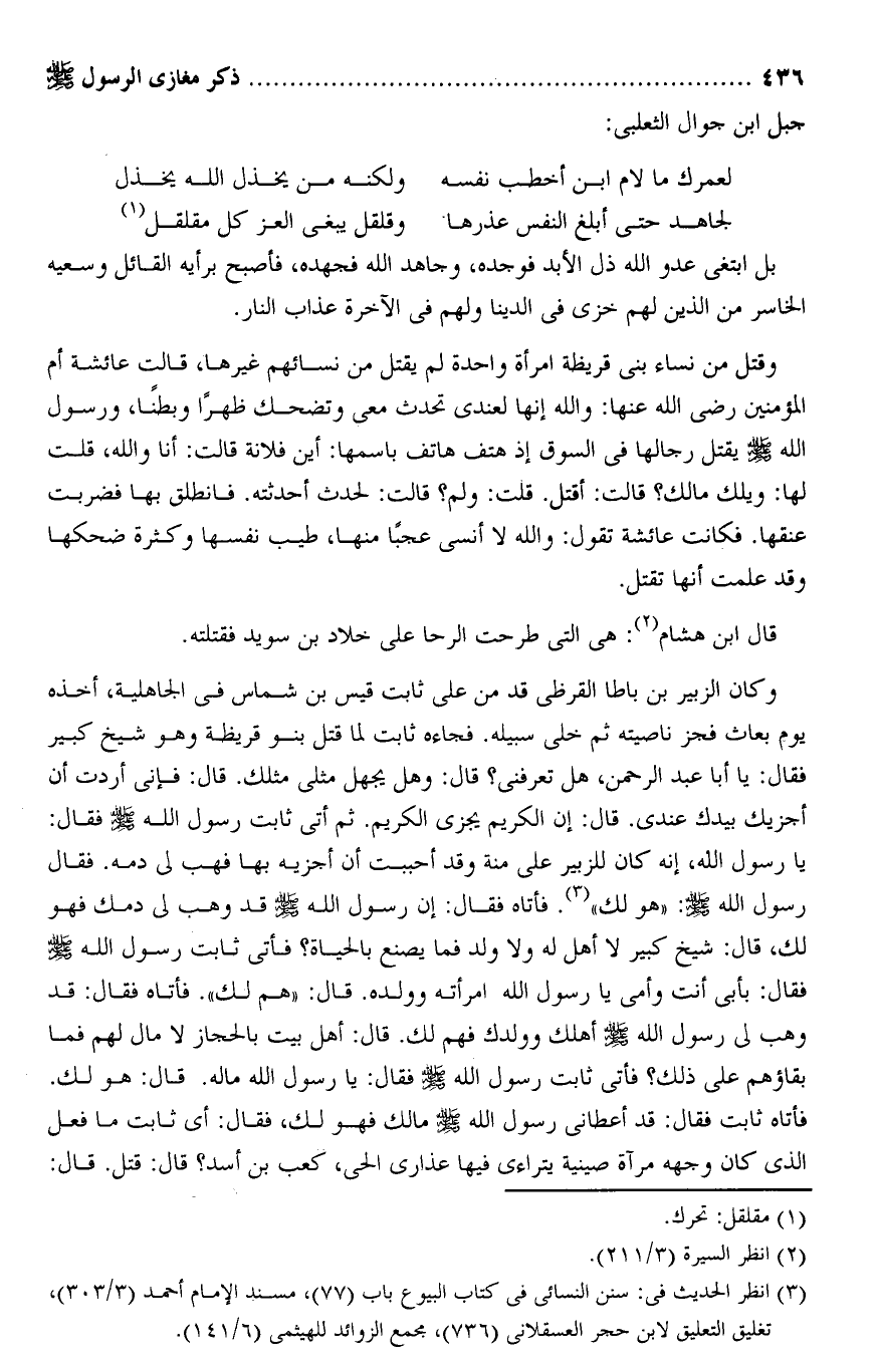 يا رسول الله، إنه كان للزبير على منة وقد أحببت أن أجزيه بها فهب لى دمه. فقال رسول الله صلى الله عليه وسلم: «هو لك» «3» . فأتاه فقال: إن رسول الله صلى الله عليه وسلم قد وهب لى دمك فهو لك، قال: شيخ كبير لا أهل له ولا ولد فما يصنع بالحياة؟ فأتى ثابت رسول الله صلى الله عليه وسلم فقال: بأبى أنت وأمى يا رسول الله امرأته وولده. قال: «هم لك» . فأتاه فقال: قد وهب لى رسول الله صلى الله عليه وسلم أهلك وولدك فهم لك. قال: أهل بيت بالحجاز لا مال لهم فما بقاؤهم على ذلك؟ فأتى ثابت رسول الله صلى الله عليه وسلم فقال: يا رسول الله ماله. قال: هو لك.