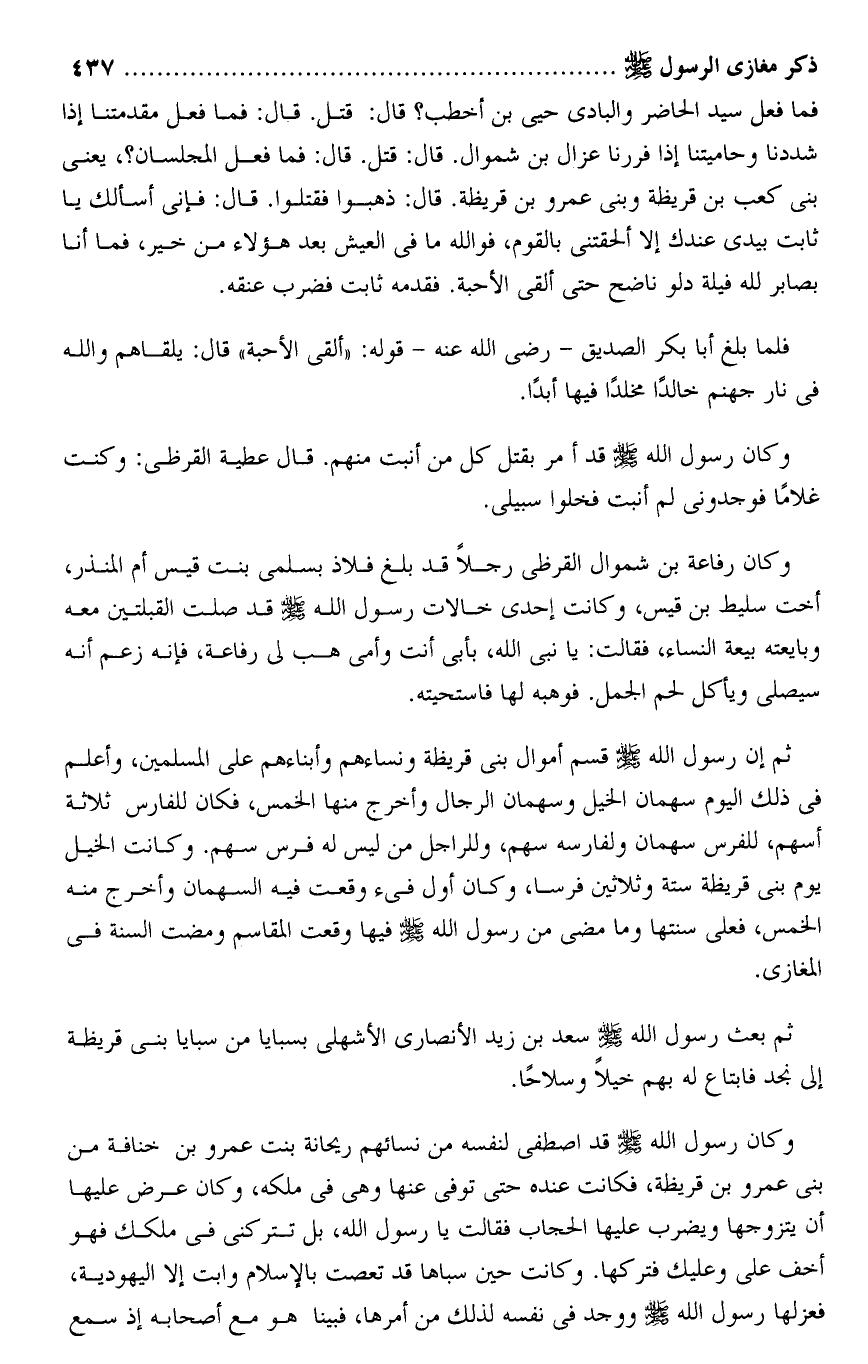 ثم إن رسول الله صلى الله عليه وسلم قسم أموال بنى قريظة ونساءهم وأبناءهم على المسلمين، وأعلم فى ذلك اليوم سهمان الخيل وسهمان الرجال وأخرج منها الخمس، فكان للفارس ثلاثة أسهم، للفرس سهمان ولفارسه سهم، وللراجل من ليس له فرس سهم. وكانت الخيل يوم بنى قريظة ستة وثلاثين فرسا، وكان أول فىء وقعت فيه السهمان وأخرج منه الخمس، فعلى سنتها وما مضى من رسول الله صلى الله عليه وسلم فيها وقعت المقاسم ومضت السنة فى المغازى.