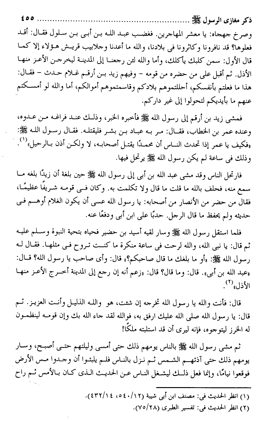 وصرخ جهجاه: يا معشر المهاجرين. فغضب عبد الله بن أبى بن سلول فقال: أقد فعلوها؟ قد نافرونا وكاثرونا فى بلادنا، والله ما أعدنا وجلابيب قريش هؤلاء إلا كما قال الأول: سمن كلبك يأكلك، وأما والله لئن رجعنا إلى المدينة ليخرجن الأعز منها الأذل. ثم أقبل على من حضره من قومه- وفيهم زيد بن أرقم غلام حدث- فقال:
