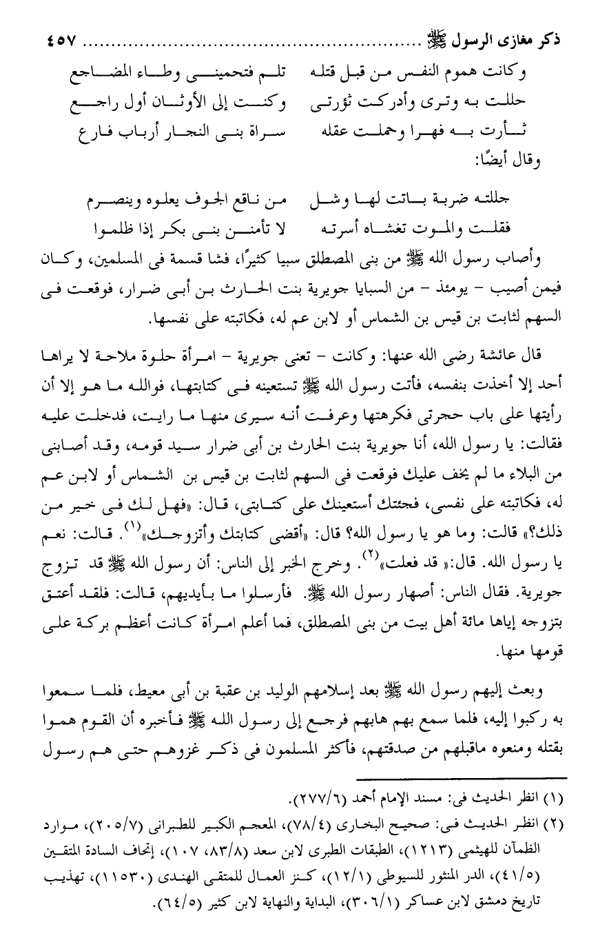 وأصاب رسول الله صلى الله عليه وسلم من بنى المصطلق سبيا كثيرا، فشا قسمة فى المسلمين، وكان فيمن أصيب- يومئذ- من السبايا جويرية بنت الحارث بن أبى ضرار، فوقعت فى السهم لثابت بن قيس بن الشماس أو لابن عم له، فكاتبته على نفسها.