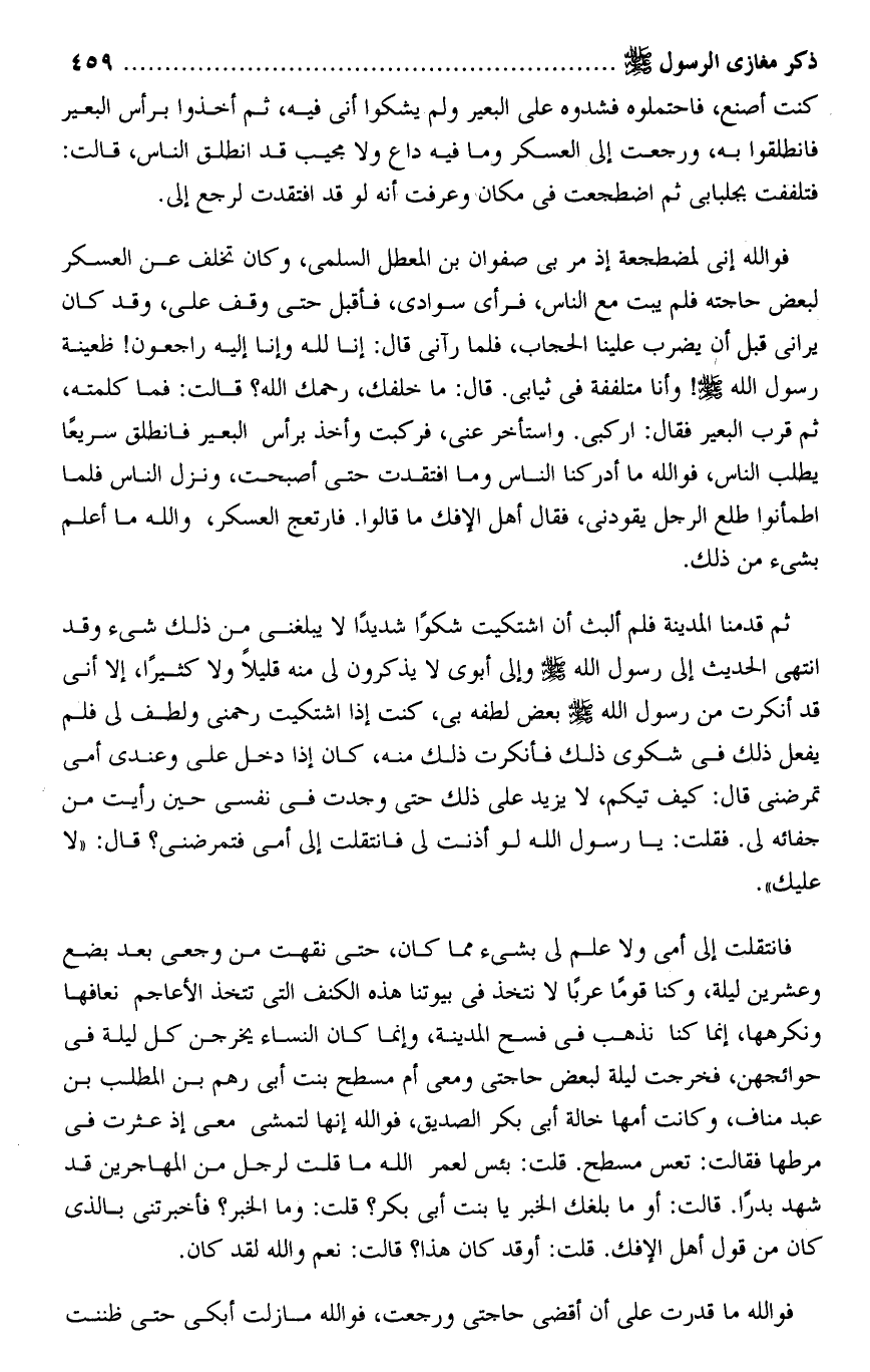 فو الله إنى لمضطجعة إذ مر بى صفوان بن المعطل السلمى، وكان تخلف عن العسكر لبعض حاجته فلم يبت مع الناس، فرأى سوادى، فأقبل حتى وقف على، وقد كان يرانى قبل أن يضرب علينا الحجاب، فلما رآنى قال: إنا لله وإنا إليه راجعون! ظعينة رسول الله صلى الله عليه وسلم! وأنا متلففة فى ثيابى. قال: ما خلفك، رحمك الله؟ قالت: فما كلمته، ثم قرب البعير فقال: اركبى. واستأخر عنى، فركبت وأخذ برأس البعير فانطلق سريعا يطلب الناس، فو الله ما أدركنا الناس وما افتقدت حتى أصبحت، ونزل الناس فلما اطمأنوا طلع الرجل يقودنى، فقال أهل الإفك ما قالوا. فارتعج العسكر، والله ما أعلم بشىء من ذلك.