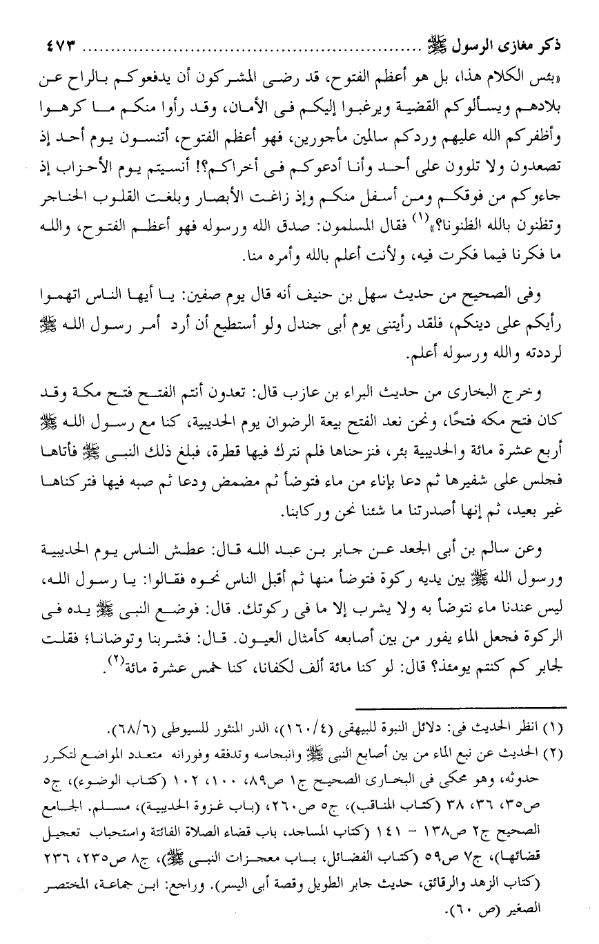 وخرج البخارى من حديث البراء بن عازب قال: تعدون أنتم الفتح فتح مكة وقد كان فتح مكة فتحا، ونحن نعد الفتح بيعة الرضوان يوم الحديبية، كنا مع رسول الله صلى الله عليه وسلم أربع عشرة مائة والحديبية بئر، فنزحناها فلم نترك فيها قطرة، فبلغ ذلك النبى صلى الله عليه وسلم فأتاها فجلس على شفيرها ثم دعا بإناء من ماء فتوضأ ثم مضمض ودعا ثم صبه فيها فتركناها غير بعيد، ثم إنها أصدرتنا ما شئنا نحن وركابنا.