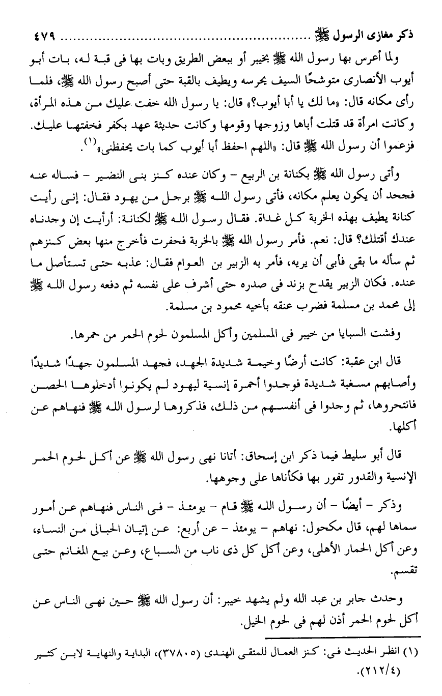 وأتى رسول الله صلى الله عليه وسلم بكنانة بن الربيع- وكان عنده كنز بنى النضير- فساله عنه فجحد أن يكون يعلم مكانه، فأتى رسول الله صلى الله عليه وسلم برجل من يهود فقال: إنى رأيت كنانة يطيف بهذه الخربة كل غداة. فقال رسول الله صلى الله عليه وسلم لكنانة: أرأيت إن وجدناه عندك أقتلك؟ قال: نعم. فأمر رسول الله صلى الله عليه وسلم بالخربة فحفرت فأخرج منها بعض كنزهم ثم سأله ما بقى فأبى أن يريه، فأمر به الزبير بن العوام فقال: عذبه حتى تستأصل ما عنده. فكان الزبير يقدح بزند فى صدره حتى أشرف على نفسه ثم دفعه رسول الله صلى الله عليه وسلم إلى محمد بن مسلمة فضرب عنقه بأخيه محمود بن مسلمة.