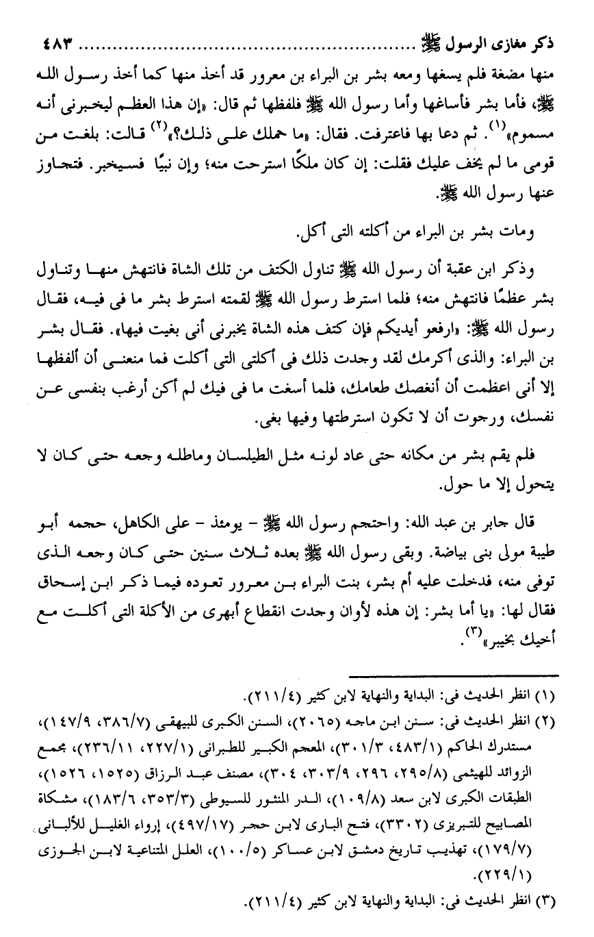وذكر ابن عقبة أن رسول الله صلى الله عليه وسلم تناول الكتف من تلك الشاة فانتهش منها وتناول بشر عظما فانتهش منه؛ فلما استرط رسول الله صلى الله عليه وسلم لقمته استرط بشر ما فى فيه، فقال رسول الله صلى الله عليه وسلم: «ارفعوا أيديكم فإن كتف هذه الشاة يخبرنى أنى بغيت فيها» . فقال بشر بن البراء: والذى أكرمك لقد وجدت ذلك فى أكلتى التى أكلت فما منعنى أن ألفظها إلا أنى اعظمت أن أنغصك طعامك، فلما أسغت ما فى فيك لم أكن أرغب بنفسى عن نفسك، ورجوت أن لا تكون استرطتها وفيها بغى.