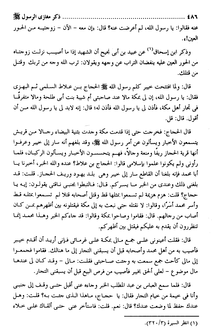 قال: فلما سمع العباس بن عبد المطلب الخبر وجاءه عنى أقبل حتى وقف إلى جنبى وأنا فى خيمة من خيام التجار فقال: يا حجاج، ما هذا الذى جئت به؟ قلت: وهل عندك حفظ لما وضعت عندك؟ قال: نعم. قلت: فاستأخر عنى حتى ألقاك على خلاء