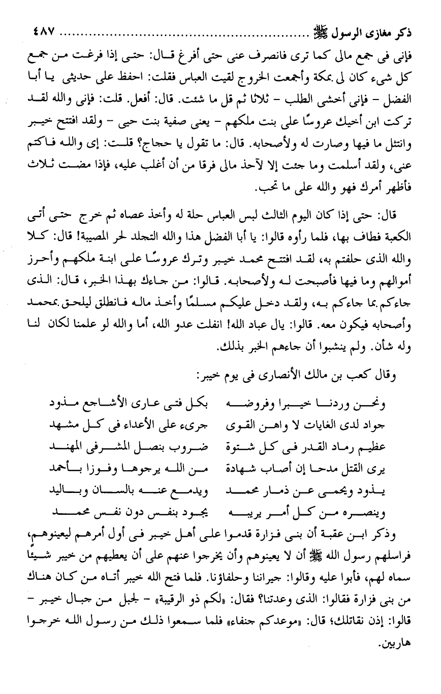 فإنى فى جمع مالى كما ترى فانصرف عنى حتى أفرغ قال: حتى إذا فرغت من جمع كل شىء كان لى بمكة وأجمعت الخروج لقيت العباس فقلت: احفظ على حديثى يا أبا الفضل- فإنى أخشى الطلب- ثلاثا ثم قل ما شئت. قال: أفعل. قلت: فإنى والله لقد تركت ابن أخيك عروسا على بنت ملكهم- يعنى صفية بنت حيى- ولقد افتتح خيبر وانتثل ما فيها وصارت له ولأصحابه. قال: ما تقول يا حجاج؟ قلت: إى والله فاكتم عنى، ولقد أسلمت وما جئت إلا لآحذ مالى فرقا من أن أغلب عليه، فإذا مضت ثلاث فأظهر أمرك فهو والله على ما تحب.