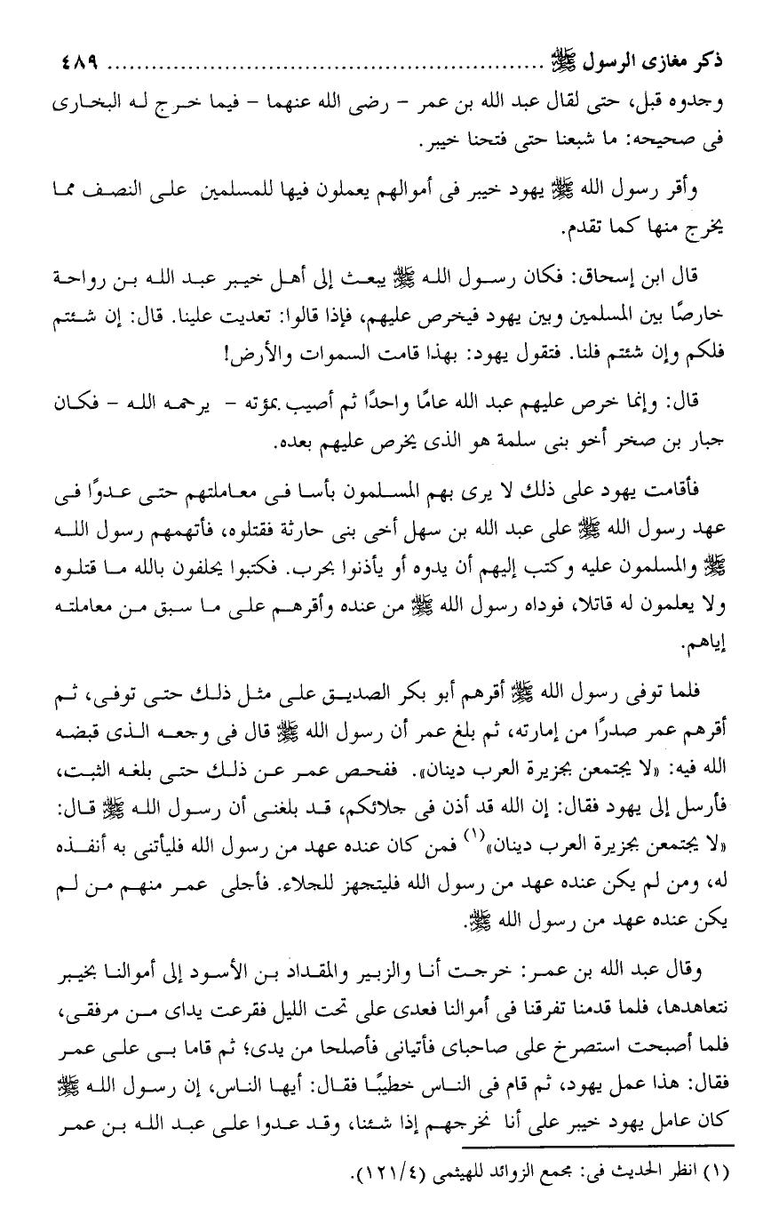فلما توفى رسول الله صلى الله عليه وسلم أقرهم أبو بكر الصديق على مثل ذلك حتى توفى، ثم أقرهم عمر صدرا من إمارته، ثم بلغ عمر أن رسول الله صلى الله عليه وسلم قال فى وجعه الذى قبضه الله فيه: «لا يجتمعن بجزيرة العرب دينان» . ففحص عمر عن ذلك حتى بلغه الثبت، فأرسل إلى يهود فقال: إن الله قد أذن فى جلائكم، قد بلغنى أن رسول الله صلى الله عليه وسلم قال: