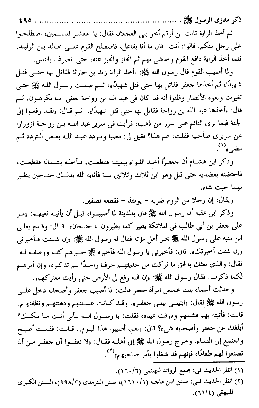 أبلغك عن جعفر وأصحابه شىء؟ قال: «نعم، أصيبوا هذا اليوم» . قالت: فقمت أصيح واجتمع إلى النساء. وخرج رسول الله صلى الله عليه وسلم إلى أهله فقال: «لا تغفلوا آل جعفر من أن تصنعوا لهم طعاما، فإنهم قد شغلوا بأمر صاحبهم» «2» .