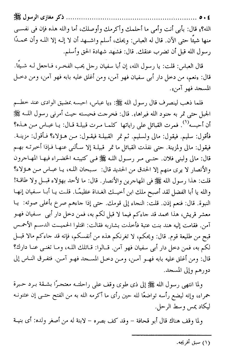 قلت: هذا رسول الله صلى الله عليه وسلم فى المهاجرين والأنصار. قال: ما لأحد بهؤلاء قبل ولا طاقة! والله يا أبا الفضل لقد أصبح ملك ابن أخيك الغداة عظيما. قلت يا أبا سفيان إنها النبوة. قال: فنعم إذن. قلت: النجاء إلى قومك. حتى إذا جاءهم صرخ بأعلى صوته: يا معشر قريش، هذا محمد قد جاءكم فيما لا قبل لكم به، فمن دخل دار أبى سفيان فهو آمن. فقامت إليه هند بنت عتبة فأخذت بشاربه فقالت: اقتلوا الحميت الدسم الأحمس قبح من طليعة قوم. قال: ويحكم، لا تغرنكم هذه من أنفسكم، فإنه قد جاءكم مالا قبل لكم به، فمن دخل دار أبى سفيان فهو آمن. قالوا: قاتلك الله، وما تغنى عنا دارك؟