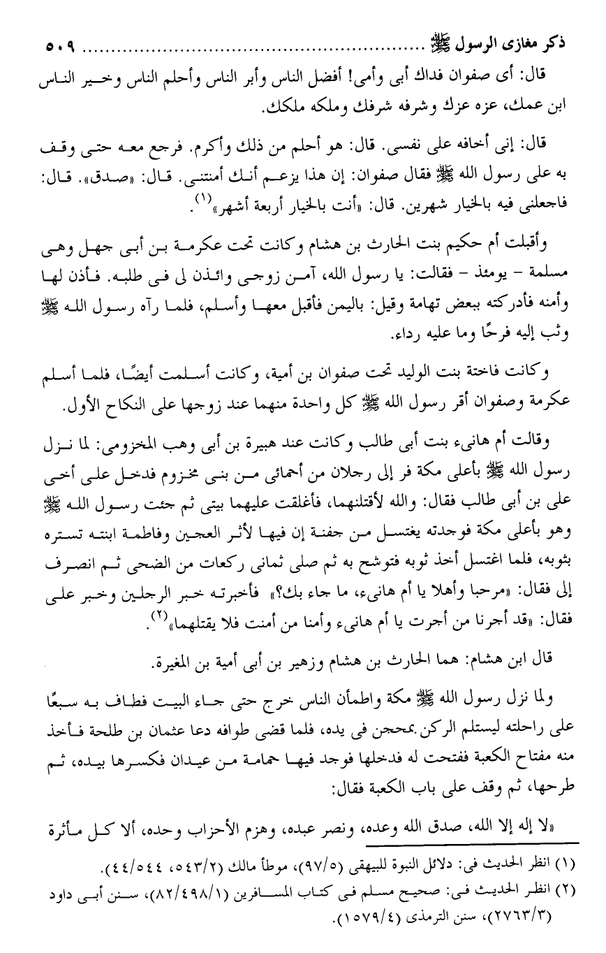 قال: إنى أخافه على نفسى. قال: هو أحلم من ذلك وأكرم. فرجع معه حتى وقف به على رسول الله صلى الله عليه وسلم فقال صفوان: إن هذا يزعم أنك أمنتنى. قال: «صدق» . قال:
