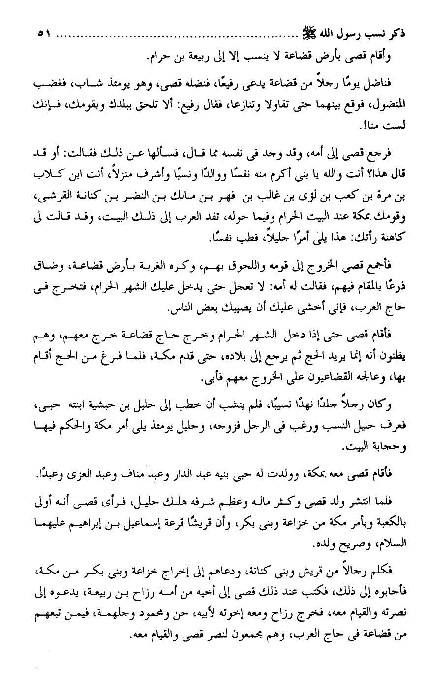 فرجع قصى إلى أمه، وقد وجد فى نفسه مما قال، فسألها عن ذلك فقالت: أو قد قال هذا؟ أنت والله يا بنى أكرم منه نفسا ووالدا ونسبا وأشرف منزلا، أنت ابن كلاب بن مرة بن كعب بن لؤى بن غالب بن فهر بن مالك بن النضر بن كنانة القرشى، وقومك بمكة عند البيت الحرام وفيما حوله، تفد العرب إلى ذلك البيت، وقد قالت لى كاهنة رأتك: هذا يلى أمرا جليلا، فطب نفسا.