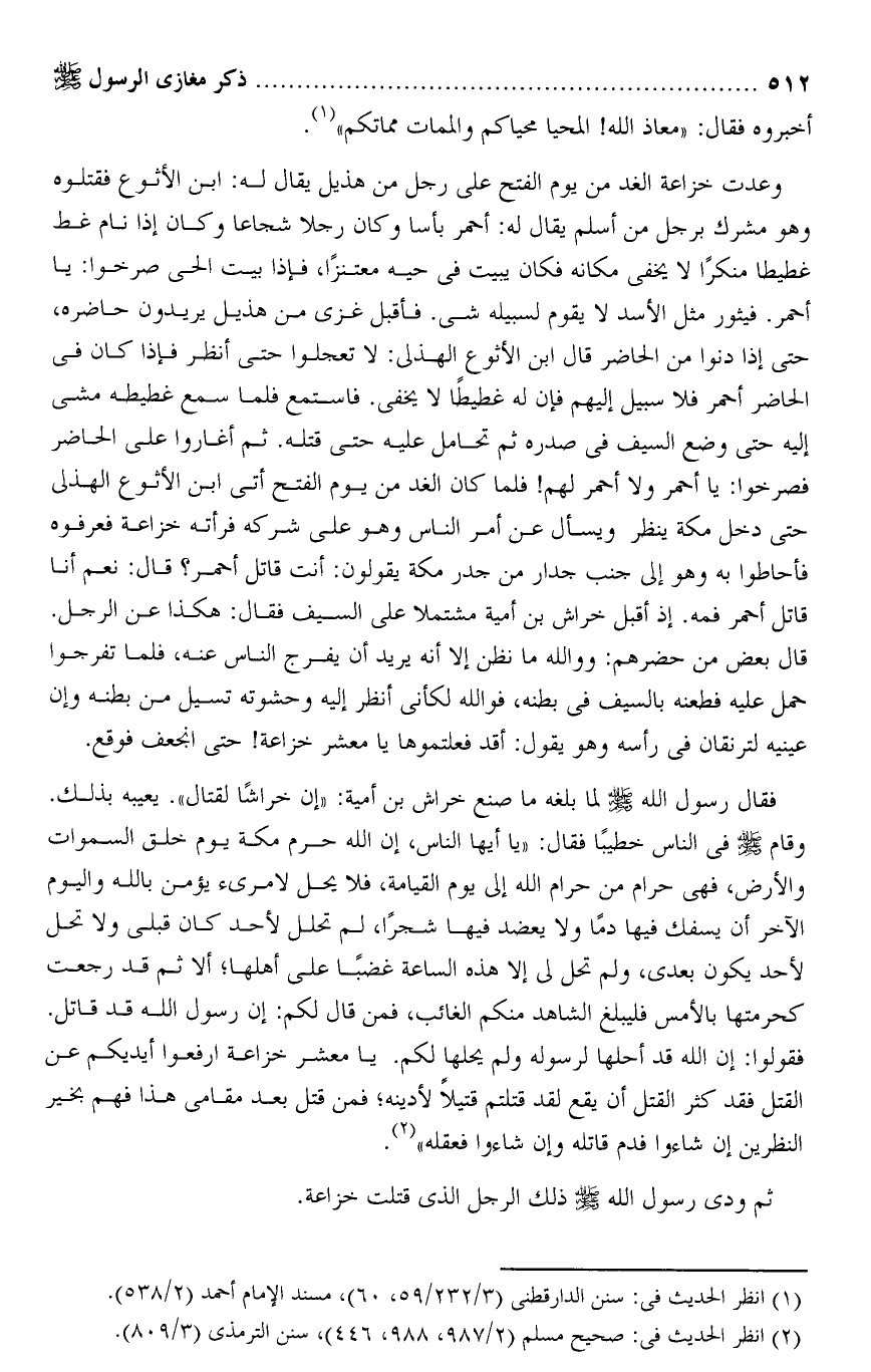 فقولوا: إن الله قد أحلها لرسوله ولم يحلها لكم. يا معشر خزاعة ارفعوا أيديكم عن القتل فقد كثر القتل أن يقع لقد قتلتم قتيلا لأدينه؛ فمن قتل بعد مقامى هذا فهم بخير النظرين إن شاؤا فدم قاتله وإن شاؤا فعقله» «2» .